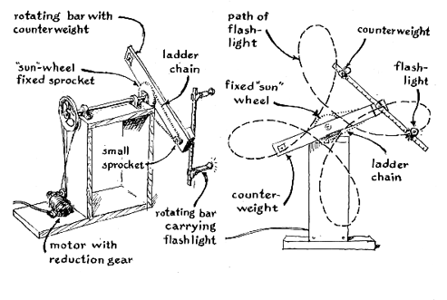 "Equally interesting are crank machines, particularly those that generate hypotrochoids and epitrochoids. A hypotrochoid results when one circle is made to roll inside another; an epitrochoid, when one circle rolls outside another. Machines of this type can be adjusted for generating the family of curves that includes the cardioid, limacon, deltoid, astroid, trifolium, quadrifolium, ellipse, circle and even the straight line. "A simple crank machine has been constructed by Everett Clement of Peterborough, N.H. He undertook the project as a means of investigating the patterns that appear on the face of a cathode-ray oscilloscope when two electrical signals of appropriate wave form and phase relation are applied to the input terminals. His device consists of a motor-driven arm that carries at its outer end a second arm rotated by means of a planetary sprocket and a ladder chain that engages a 'sun,' or fixed, sprocket [see upper illustration above]. A flashlight carried by the second arm is photographed by time exposure in a darkened room. The motion of the first arm describes a circle, whereas the flashlight, which marks a point on the second circle, generates hypotrochoids. The radius of the figure can be adjusted by altering the position of the flashlight on its supporting arm.