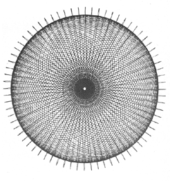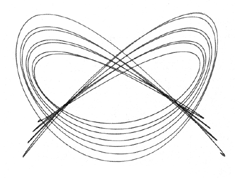 "Although several versions of easily constructed harmonographs have been presented along with examples of the figures they generate, the subject would not be complete without at least passing mention of the basic physical and mathematical principles that underlie the production of the designs. Simple harmonic motion has rather a special meaning in the field of physics: the projection on any diameter of a point-moving in a circle at uniform velocity. As rigorously described, the position of the projected point at any instant is equal to the product of the angular velocity of the point, the time in seconds that it has moved and the trigonometric sine of the angle through which it has moved. This type of motion-rapid near the center and slowing down gradually to a stop at one end, then accelerating toward the center only to slow down and stop again at the opposite end-was doubtless as familiar to the caveman dangling from a vine as it is to the modern child on a swing. Other examples include the motion of a weight bobbing at the end of a rubber band and various kinds of vibration-of a violin string, of air compressions in wind instruments of the pipe family and of subatomic particles responsible for the emission of electromagnetic waves. In short, the mode by harmonograms is found at the root of all natural phenomena." The subatomic
