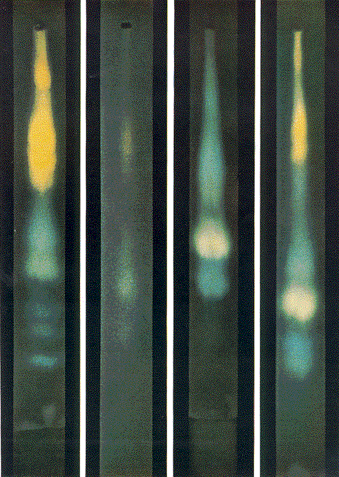 "Two glass jars of about 50-milliliter capacity are placed on the lower platform of the framework. These each contain 30 milliliters of a solution that by evaporation brings about an equilibrium between the atmosphere of the chamber and the vapor content of the filter paper. One can make a 100-milliliter stock of this solution by diluting 2S.9 milliliters of 27 percent ammonium hydroxide with distilled water. The entire apparatus must be carefully leveled before use so that the surface of the solvent in the container makes a right angle with respect to the center line of the paper strip. "Chromatograms are made on strips of Whatman No. 1 chromatography paper cut four inches wide and 22 inches long. My paper was bought from Howe and French, 99 Broad Street, Boston, Mass. 02110. It comes in sheets 18 3/4 inches long by 22 1/2 inches wide. As an aid in placing specimens uniformly on the paper I draw a light pencil line squarely across each strip at a distance of 6 3/4 inches from one end and divide the line into five equal intervals by four light pencil dots. The material to be analyzed is placed on these dots. "To prepare for the analysis of adult flies first anesthetize selected specimens of the same age. Age is an important factor because the concentration of pteridines in the flies varies during the life cycle. The concentration also differs substantially between the head and the body. Moreover, the chromatograms of males differ from those of females. "One begins a typical experiment by severing the heads of 10 flies with a razor blade and squashing the material onto the paper with the end of a glass rod. I always reserve the right-hand dot for the control specimen, which is prepared by applying to the dot the heads of 10 Oregon-R wild-type flies. If the control specimen fails to separate as anticipated, the chromatogram is discarded. The control also provides a convenient cross-check for estimating the amounts of pteridines in other specimens in relation to those naturally present in the wild type. "When one is making chromatograms of fly bodies rather than heads, one must take care to separate all head tissue cleanly. A small amount of head tissue can contain more pteridines than a whole body, hence even a tiny fragment can seriously distort a body chromatogram. The bodies are boiled in water for three minutes to coagulate the protein and thus facilitate the chromatographic separation. After boiling they are placed on paper toweling to remove excess water. Five bodies are applied to each spot. All spots must be dried at room temperature before the chromatographic paper is placed in the apparatus. In addition, a pencil notation is made next to each spot that. includes its descriptive initials-such as p for plum eye, st for scarlet or brightred eye, v for vermilion eye, w for white-eye mutants, bw for brownish eye, wa for white-apricot eye-together with the date and time. "After the paper strip has dried, the solvent pan is placed on the upper platform of the framework. The strip is then draped over the upper glass rod and anchored in place by the butter dish. The loose end of the strip is threaded between the lower glass rod and the framework so that it hangs freely suspended. Paper clips of the pinch type are attached to the bottom edge as weights. The ammonium hydroxide containers are then put on the lower platform. Now the entire assembly is placed in the glass housing, covered by the g]ass top, draped with a cloth that excludes light and left undisturbed for two hours. During this interval the vapor content of the paper reaches equilibrium with the atmosphere of ammonia released by the ammonium hydroxide. Good separations cannot be expected if the interval of equilibration is stinted. "When equilibration is complete, remove the cloth cover and the paraffin plug and insert into the solvent container a rubber tube equipped with a small plastic funnel. This is used to transfer 230 milliliters of developing solvent into the tray. The solvent consists of 360 milliliters of 1-propanol (n-propyl alcohol), 45 milliliters of 7 percent aqueous ammonia and 135 milliliters of distilled water. Finally, remove the rubber tubing, reinsert the paraffin plug promptly, cover the apparatus to exclude light and maintain the room temperature at 68 degrees F. for 20 hours. At the end of this interval remove the chromatogram from the apparatus. Handle the paper by its ends and suspend it upside down for drying at room temperature. Return the solvent and equilibrating solutions to their respective storage bottles. "When the chromatogram has dried, it can be examined under an ultraviolet lamp. If all has gone well, the characteristic fluorescent bands will appear [see Figure 1]. Caution: Never look directly at the bulb of an ultraviolet lamp. The rays are injurious to the eyes. Protective goggles should always be worn when working with ultraviolet radiation. Dual lamps that emit ultraviolet at wavelengths of 2,537 and 3,660 angstrom units and operate from regular house current are available from the Edmund Scientific Co. of Barrington, N.J. Pteridines that emit blue or violet light glow with greatest brilliance when they are irradiated at a wavelength of 3,660 angstroms; those that emit reds or yellows appear brightest when they are irradiated at a wavelength of 2,537 angstroms. "Chromatograms should be examined and evaluated as soon as they dry because the fluorescent compounds tend to fade with time. As a convenience in scoring and recording the results I prepare a table in advance. Symbols designating all specimens are listed in a column that extends down the left edge of the page [see Figure 7]. A similar row across the top of the page lists the several pteridines: DRO for drosopterins that fluoresce orange-red; XAN for xanthopterin, green; SP for sepiapterin, yellow; AHP for 2-amino-4-hydroxypteridine, blue; BIO for biopterin, blue; ISO for isoxanthopterin, violet, and RFL for riboflavinlike compounds