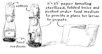 "To milk bottles that have been thoroughly washed and boiled in water add the food mixture to a depth of about half an inch by means of a funnel that prevents food from spattering on the glass. Wipe any condensed water from the inner wall of the bottle. Plug the opening of each bottle with an unwaxed paper cap or a tuft of cotton covered with a piece of cheesecloth. Place the bottles in a pressure cooker containing about 100 milliliters of water and boil for 30 minutes at a pressure of 15 pounds per square inch. "After sterilization stand the capped bottles on a convenient wooden shelf or table until any large drops of water adhering to the inner wall evaporate. This step is important because in an excessively moist bottle the flies may get stuck in the food medium and drown. Excessive moisture can be removed with a sterilized paper towel. When the interior of the bottle is dry, fold a piece of sterilized paper toweling 11 inches long and 2 1/2 inches wide into quarters, so that the folded sheet measures 2 3/4 by 2 1/2 inches, and push one end below the surface of the food medium. The paper strip provides a place on which Drosophila larvae can pupate. Drosophila thrive on a fermenting medium. This is provided by sprinkling a pinch of Fleischmann's active dry yeast over the surface of the food. Each bottle is then carefully labeled with the name of the type of fly it will house and the date.