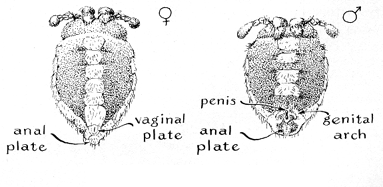 "The flies must be counted as one step in nearly all experiments. It is also often necessary to separate them by sex, type, age and so on. During such steps the anesthetized specimens are manipulated by means of a small camel's-hair brush, preferably on a smooth white surface such as white glass or a sheet of clear glass that rests on white paper. The sex of specimens is easily determined by examining inverted flies under a five-power magnifying glass. The distinguishing sexual features appear in the accompanying illustration [below]. "Normally flies remain anesthetized for five to 10 minutes. Some individuals revive sooner than others. These can be anesthetized again by inverting over them a Petri dish or other shallow container into which is fastened a small piece of paper toweling moistened with a few drops of ether. Remove specimens from the ether promptly when they stop moving. Overexposure will kill them. "After a culture has been maintained for 20 days transfer all adults to a fresh culture bottle. Recap the old bottle and 48 hours later transfer the young flies that have hatched during the interval to a fresh culture bottle. The old flies can be used to start new cultures. Develop scrupulously clean work habits in order to avoid contaminating or mixing cultures. Specimen types can be mixed accidentally, for example, by transferring a soiled glass rod or other implement to which an egg adheres from one bottle to another.