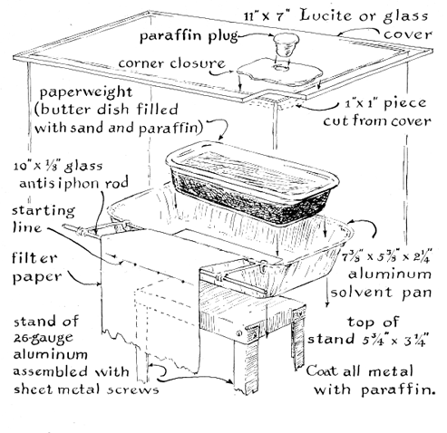 "For separating the pteridines I use a chromatographic apparatus of the descending-paper type. Essentially it consists of a closed glass box that houses an elevated container of solvent in which the upper end of the paper is immersed. The dimensions of the apparatus are shown in the accompanying illustration [below]. A square inch of glass is cut from one corner of the close-fitting cover to provide access for transferring the solvent to the container. This opening is sealed with a thick sheet of paraffin in which a round hole about half an inch in diameter is made. The hole is then fitted with a removable stopper, which is also made of paraffin. The container for the solvent, which rests on the top platform of a removable framework, can be any convenient shallow vessel about seven inches long and an inch or two deep. I use an aluminum pan that rests on a framework made of parts from an old Erector set. "Brackets of wire and paraffin, attached to one edge of the pan, support a slender glass rod 10 inches long over which a piece of moist filter paper is draped. In addition to serving as a support for the paper, the rod prevents a siphoning action that would cause the solvent to flow; the only kind of flow should be that due to capillary action. The upper edge of the paper strip is weighted against the bottom of the solvent container by a glass butter dish filled with sand held in place by a layer of melted paraffin. A second glass rod, attached about halfway down the framework, serves as a stop to keep the paper away from the glass housing.