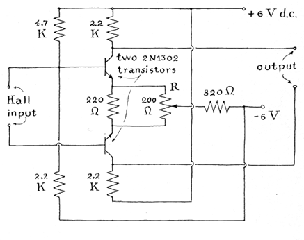 "Perhaps the simplest application of the device is also the one of most interest to amateurs: its use as a fluxmeter for measuring the strength of magnetic fields. Few laymen normally have access to fluxmeters of the conventional type, in which a voltage is generated in a moving coil of wire by the field under measurement. The Hall device generates a continuous output that varies in direct proportion to the field strength as long as current is maintained through the sensitive element. It requires no moving parts and can measure fields of constant intensity as well as alternating fields, including those that oscillate at the radio frequencies. It senses only the portion of the field that passes through the semiconductor and it can therefore be used to explore and to chart the contour of nonuniform fields and of stray fields. "A gauss meter for measuring the strength of magnetic fields can be built by amateurs. It makes use of a Hall device such as the Type BH200 manufactured by F. W. Bell, Inc. (1356 Norton Avenue, Columbus, Ohio 43212). The unit can be energized by a six-volt dry battery through a 33-ohm resistor. A 1,000-ohm potentiometer should be connected across the input terminals of the Hall device, with the sliding contact connected to one side of the meter circuit, for adjusting the meter indication to zero in the absence of a magnetic field. The output voltage is measured by connecting a millivoltmeter to the output terminals of the device. If the experimenter wishes, the calibration of the meter can be adjusted by inserting a resistor in series with one of its leads [see upper illustration above]. The value of this resistor will depend on the characteristics of the meter and the desired scale. It must be determined experimentally. "A more sensitive instrument for measuring field strength (and one that is easily adaptable for other experiments) can be made. To do so one equips the Hall device with an amplifier that includes two transistors connected differentially so that the performance of one compensates for that of the other when the characteristics of the pair are altered by variations of temperature or other disturbances [see lower illustration above]. The unit will amplify both direct and alternating current. It includes a potentiometer for adjusting the meter to zero indication in the absence of a magnetic field. A vacuum-tube voltmeter, connected to the output of the amplifier, is used for measuring the amplified output voltage of the Hall device. The amplified output amounts to about two volts per 1,000 gauss of magnetic-field strength. Alternating fields of course generate an alternating output voltage, which must be measured by a voltmeter designed for use with alternating current.
