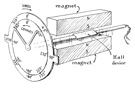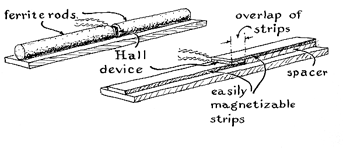 "The BH200 Hall device can be bought separately from F. W. Bell, Inc., or as part of an inexpensive kit that includes a transistor amplifier, a pair of bar magnets of approximately known field strength and an explanatory booklet. To calibrate the gauss meter with these magnets the experimenter simply places the Hall device against the surface of either magnet in a position that produces the highest meter reading. In addition to functioning as a gauss meter, the apparatus included in the kit can be used for demonstrating the pattern of magnetic-field lines in the space around a magnet and for investigating the directional effect of field lines with respect to the plane of the Hall device. The device also can act as a linear-displacement and an angular-displacement transducer and as a proximity detector and position sensor. "To measure angles in terms of trigonometric functions, for example, the Hall device is mounted on a shaft that is free to rotate between the two bar magnets. One end of the shaft is equipped with a pair of pointers for indicating angular displacement [see upper illustration below]. When one of the pointers indicates zero degrees, the output voltage is proportional to the trigonometric sine of the angle indicated by the second pointer and to the cosine of the angle indicated by the first pointer. By mounting a pair of Hall devices on the shaft, displaced 90 degrees in relation to each other, the device will generate sine and cosine outputs simultaneously. It will also act as a rectangular-to-polar coordinate converter. "The sensitivity of the Hall probe in large homogeneous fields can be increased by the use of flux collectors: two lengths of ferromagnetic material such as iron or ferrite bars. The device can be sandwiched between the butted ends of the bars or between the overlapped ends [see lower illustration below]. The lines of magnetic flux in the vicinity are attracted by the ferromagnetic material and are thereby concentrated in the Hall device. Long, slender rods are more effective than short ones. For maximum sensitivity the air gap between the rods occupied by the Hall device should be made as small as possible because an air gap has the effect of shortening the rods. The area of the rods in contact with the Hall device should equal that of the sensitive portion of the semiconducting material.