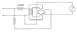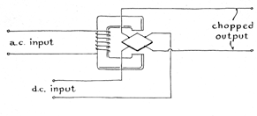 "An effective flux concentrator can be made from strips of laminated sheet iron removed from an old transformer. Several laminations are stacked to make a rod of rectangular cross section. If the laminations happen to be slightly magnetized, as may be the case with laminations removed from the transformer of an old radio set, they can be demagnetized before use by passing the strips through a coil of 100 turns or more that carries several amperes of 60-cycle alternating current. Flux concentrators can easily increase by a hundredfold the strength of the magnetic field in space that acts on the Hall device. "Tests were made of a type BH100 Hall device, a more sensitive unit than the BH200. The BH700 device was equipped with a high-gain transistor amplifier and a flux concentrator consisting of a pair of nickel-alloy steel strips three inches long, 1/4 inch wide and .014 inch thick. The tests produced a response of one volt in the earth's field when a current of 14 milliamperes was applied to the device. The probe was zeroed in the presence of the earth's field by adjusting the balancing potentiometer of the amplifier for peak readings as the probe was reversed in the earth's field and finally rotated to the intermediate or null position. "An interesting sensitivity test was also made with the BH700 device. First the zero controls were adjusted so that the two peak responses due to the earth's field were equal in amplitude. The probe was rotated to the position of zero output, the null point, and securely fastened. The gain of the amplifier was then increased until the null potential measured five millivolts. The Hall device was energized by alternating current at 400 cycles per second for amplification by a high-gain alternating current amplifier. The current in the Hall device was then increased to 200 milliamperes, its rated limit. At this point the zero controls became so sensitive that a 10-turn potentiometer had to be substituted for the single-tun1 'coarse' potentiometer of the amplifier. "At this critical adjustment the sensitivity of the instrument was computed to be 1.7 x 10-4 gauss, equivalent to 17 gammas. (The horizontal intensity of the earth's magnetic field in the Northern Hemisphere varies from about 8,000 to 30,000 gammas.) Operation at a sensitivity this extreme is not at all impossible. The stability of the instrument is quite good if care is taken to maintain a constant current through the Hall device and to protect it from strains and temperature changes. The probe must be fixed so that its plane is perpendicular to the earth's field. An angular displacement will generate a large change in the output voltage. "Ferromagnetic rods for concentrating magnetic flux display their maximum response to fields that parallel the long axis of the assembly and their minimum response to transverse fields. Surfaces of equal response in the space near the rods appear approximately as spheres positioned around each end of the rod with centers on the axis of the rod. It is possible to distort or reshape the spatial response by adjusting the balancing potentiometer. This action reshapes the null plane of the concentrator into a conical surface around the axis of one pole of the concentrator, reduces the sensitive lobe inside the cone and increases the size of the opposite lobe. "Continued adjustment will ultimately reduce the small lobe to zero and convert the null cone into a null line that coincides with the axis. With the apparatus adjusted for high sensitivity and the output zeroed with the probe in a fixed relation to the earth's field, any magnetic change in the environment, such as one caused by energizing an electromagnet, will be detected independently of the earth's field. Metal objects that are assumed to be demagnetized often show a residual field when they are brought near the probe of an instrument in critical adjustment. In fact, it is frequently difficult to determine whether the response of the instrument is due to residual magnetism in the object or to the distortion the object introduces in the earth's field. "The Hall device can also be applied to the solution of many conventional circuit problems. For example, it makes an ideal 'chopper,' which is a device for converting weak direct current to alternating current for amplification by a high-gain alternating-current amplifier. Choppers are essential for converting weak bioelectric currents of low frequency to higher frequencies for amplification, and for converting the output of thermocouples to alternating current. Conventional choppers, particularly those of the mechanical variety that consist of motor-driven switches, tend to generate noise, or spurious currents. To chop with a Hall device, the signal to be converted is fed into the semiconductor and the electromagnet is energized with current at the frequency into which the experimenter wishes to chop the signal. The output voltage represents the arithmetical product of the direct-current signal and the alternating current supplied to the electromagnet [see Figure 6 ]. "The Hall device also lends itself readily to the measurement of electric power. The energy consumed by a load in watts is equal to the product of the current in the load and the voltage across the load. The Hall device automatically multiplies its input quantities. To apply it as a wattmeter the current in the load (or a known portion of the load current) is used to energize the electromagnet. When the voltage across the load (or a known portion of the voltage) is applied to the semiconducting material, the output voltage varies directly with the power consumed by the load [see Figure 7]. "Hall devices operate well over a wide range of frequencies. Hence they make ideal modulators. The carrier frequency of a radio transmitter can be modulated with voice signals simply by energizing the semiconductor with the high-frequency carrier current and modulating it by energizing the electromagnet with curr