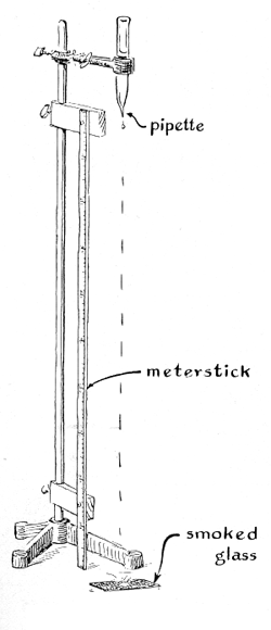 An indirect technique has been used to measure drop sizes in supercooled clouds when icing conditions exist. It is based on the fact that the thickness of the ice that forms on a cylinder exposed for a certain time to freezing drops of a certain size varies with the diameter of the cylinder. When cylinders of assorted diameters are exposed to freezing drops, the ice collected by each cylinder varies with the distribution of drop sizes in the cloud. The distribution is calculated by melting the ice and weighing the water that is recovered from each cylinder. Still other methods, such as direct photography, have been tried, but none is entirely satisfactory. In the method devised by Wilder drop diameter is indicated by the size and character of splash patterns made when drops strike a sheet of smoked glass. His experiments were done indoors; the method has not yet been tested in a natural rain cloud. The equipment consists of an apparatus stand with a scale for determining the height from which a drop of water of predetermined size falls on a sheet of smoked glass below [see Figure 1]. The drops are released by a pipette attached to the vertical rod of the apparatus stand. The resulting splash patterns are examined with a microscope and measured by a calibrated reticle in the eyepiece. Pipettes of polyethylene are available in a range of nozzle diameters for releasing drops of a desired size. Droppers can also be made easily by heating a narrow section of glass tubing approximately eight millimeters in diameter until the glass softens; one then pulls the ends apart quickly and breaks the tube at its thinnest point to form two pipettes of identical nozzle diameter. When the glass is pulled to about the diameter of a human hair, drops less than a millimeter in diameter are released if the pipette is filled with distilled water. Drops of maximum uniformity are released if the nozzle is coated with a film of silicone grease. Tubes for releasing proportionately larger drops can be made by breaking off the capillary at points of larger diameter. To make a pipette for releasing drops of maximum diameter hold the end of a length of six-millimeter tubing in a gas flame until it softens and almost closes. Attach to the opposite end of the tubing a rubber squeeze bulb for releasing the drops.