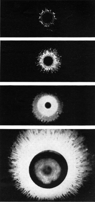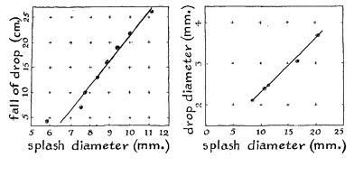 A thickness gauge is automatically built into the carbon layer. Any thinly coated slide, when held almost parallel to the rays of a light, reflects one or more bands of iridescent color, depending on the uniformity of the film. The appearance of many bands indicates either that the slide is not being moved through the flame quickly enough or that the flame is too luminous. To correct the latter condition open the air adjustment of the burner. The colors will begin to fade as the thickness of the film increases. The best thickness for making splash patterns is reached when the color just disappears. Both the height from which the drop is released and the diameter of the drop influence the size of splash patterns. "One day," Wilder writes, "I noticed that the clear inner ring of a pattern made by a drop that fell from a height of 1.5 meters was larger than one made by a drop that fell only 25 centimeters, indicating that the size of the center ring varies with the terminal velocity of the drop. Twenty runs were then made from various heights but the results were meaningless. The outer diameter of the patterns also appeared to increase uniformly with height. A series of runs was then made to check the relation. This dimension, when plotted against the height from which the drops fell, resulted in a straight graph for falls between 10 and 25 centimeters [see Figure 3]. Below five centimeters the diameter decreased disproportionately. There was not enough time to investigate the effect at heights greater than 25 centimeters.