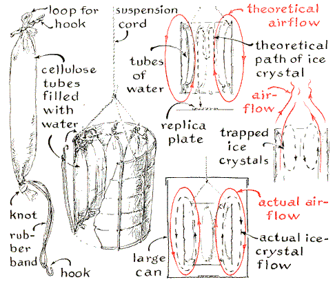 "Similarly, both the diameter of splash patterns and their overall configuration vary with the diameter of drops released from a predetermined height. In other words, the size and configuration of splash patterns bear a direct relation to drop diameter. A test made by releasing from a height of one meter drops that ranged in diameter from two to four millimeters resulted in a linear graph that included the diameter of substantially every drop. Drops of a given size always made similar patterns. I have had no opportunity to check the procedure with cloud droplets." While Wilder was investigating splash patterns, Wahl developed a miniature wind tunnel for the production of snowflakes. Essentially his device consists of an open-end cylinder lined with cellulose tubes containing water. The assembly is suspended vertically in a chamber maintained at freezing temperature. The temperature difference between the water and the air generates an updraft through the cylinder. Evaporation from the permeable cellulose tubes causes a supercooled cloud to form in the cylinder. This cloud can be "seeded" with particles of dry ice, just as natural clouds are seeded to trigger the precipitation of rain. The resulting crystals of ice are carried upward by the convection current and grow into snowflakes. Heavy flakes fall to the bottom of the cold chamber, where they can be collected in a shallow dish that contains a film of Formvar solution diluted with chloroform. When the film solidifies, impressions of the snowflakes remain. They can be examined at room temperature. The cylinder consists of a tin can at least 10 centimeters in diameter and as tall as it is wide. The inner wall of the can is lined with closely spaced casings of the kind used by meat packers for making sausages [see lower illustration at left]. If sausage casings are not available, similar tubes can be made of sheet cellulose by joining the side edges of a sheet to form a tube; the edges are held together with plastic adhesive tape that resists water. Wahl designed the assembly so that the cellulose tubes could be easily dismantled for replacing water lost by evaporation. He tied the bottom of each tube shut with a rubber band to which was attached a wire hook. When the tube is filled, the top is folded over and clamped shut with a bobby pin. After the filled casing has been placed in the assembly the rubber band is stretched around the outside of the can and attached by the wire hook to the loop of cellulose made by the top fold. The completed tunnel is suspended in the cold chamber by a sling of three wires attached to the upper rim of the can.