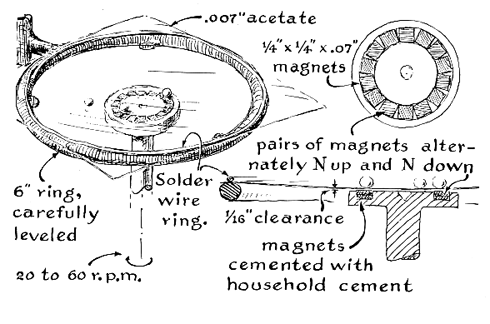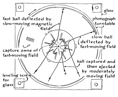 "My first model consisted of 14 pairs of 1/4-inch magnets, cemented in an annular groove machined in a disk of clear plastic [see Figure 5]. The stacks were arranged so that the magnetic poles faced alternately up and down. A hole was drilled in the center of the disk to fit a vertical spindle on which the assembly could be rotated. The speed of rotation could be varied continuously from about 10 to 100 revolutions per minute. The steel balls rolled on a thin sheet of plastic, and the plastic was in turn held in place by the ring support of an apparatus stand. "The arrangement works quite well when the magnets are rotating in the range from 20 to 40 r.p.m. Balls launched squarely across the magnetic field are either captured or deflected in random directions. Balls can be launched in a desired direction at constant and reproducible speeds by means of a small inclined track. "I next constructed a similar model equipped with the larger magnets, which were rotated by means of a nonmagnetic phonograph turntable [see Figure 6]. The disk that supported the magnets was cut from 1/2-inch plywood and was slotted radially to take 24 magnets. The poles of these magnets appear on the large faces of the rubber strips. Eight radial grooves, which terminate near the center of the disk, each hold an array of magnets assembled so that the north pole of each magnet faces the south pole of its neighbor. "A second set of radial grooves was cut midway between the first set and spaced about half an inch farther from the center than the first set. Each of these grooves holds two magnets with opposite poles in contact. The combined field of these magnets points in the same direction as that of the inner set of magnets. "The center of the disk was drilled to make a snug fit with the spindle of the phonograph. I think that the spindle is steel and that there may be a friction clutch of steel under the aluminum turntable. If so, these parts do not appear to distort the magnetic field significantly. I blocked a 12-inch square of window glass over the turntable so that it cleared the top of the magnets by about 1/32 inch. Incidentally, most window glass is slightly concave on one side and slightly convex on the other. The manufacturer's label is usually fixed to the convex side. The glass should be placed over the magnets with the concave side upward. Both the turntable and the glass were leveled to within about .005 inch by means of jacks improvised by threading a set of small blocks to accommodate cap screws. When the balls are placed on the leveled glass, they do not roll unless started, and once they are started they seem to roll equally well in all directions. "In one sense this model is more limited than the first one because the speed of rotation is restricted to 33 1/3, 45 and 78 r.p.m. On the other hand, the larger size presents a more attractive display. The accompanying illustration [Figure 7 ] depicts the typical deflection path of a 'particle' that penetrates the 'nucleus,' the capture and subsequent emission of a particle and the trajectory of a sharply deflected particle. When the field is rotated at 78 r.p.m., a large number of balls are captured. The balls seem to become sufficiently magnetized to attract each other. At 45 r.p.m. the mass becomes unstable and a few balls escape. When the speed is reduced to 33 1/3 revolutions, the mass becomes very unstable, and within seconds balls are scattering in all directions. "Balls occasionally enter the capture zone and are immediately ejected. One would be hard put to show a statistical relation between the trajectory of the balls and the nature and size of the magnetic array. I suppose it would be possible to demonstrate some effective diameter of the nucleus by a statistical analysis of the trajectories. The stack of three magnets that appears in the illustration at the half-radius point merely creates activity when there are a number of balls on the glass. These magnets might represent another near atom that would be expected to detect free particles."