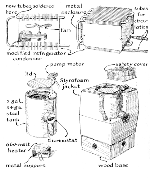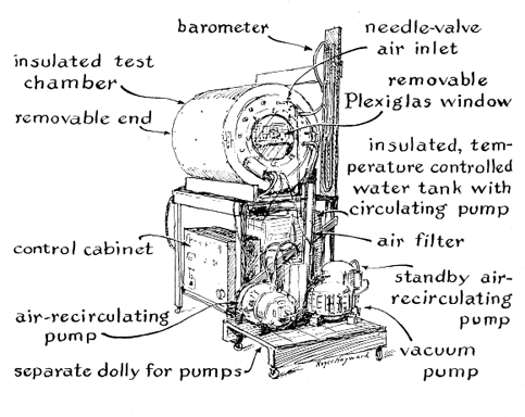 "The drum that serves as my chamber is made of 19-gauge galvanized steel [see illustration below]. One end was removed and fitted with anairtight sealing ring. A hole nine inches in diameter was cut in the other end and fitted with a 13-inch cover of clear plastic 1/4 inch thick. This window and its gasket are held in place by a circle of eight equally spaced bolts soldered to the end of the drum. Electrically insulated lead-ins are installed in the surrounding steel on the end of the drum for connecting various accessories. The outer surface of the chamber is insulated by a two-inch layer of fiber glass or rock wool held in place by forms made of plywood. The insulation helps to maintain uniform temperature in the chamber and to prevent condensation. "Air pressure in the chamber is measured by a homemade barometer consisting of a U-shaped glass tube closed at one end and partly filled with mercury. The general controls include lights inside the chamber, switches, an automatic time switch and motors that operate the compressors. The compressors, controls and a reservoir that is part of the heating system are mounted on a separate base to isolate the chamber from vibration. "The temperature of the chamber is controlled by circulating water of the appropriate temperature from a five-gallon reservoir through a radiator equipped with a small fan. For maintaining temperatures above that of the room a thermostat inside the chamber controls a 660-watt electrical heating unit in the reservoir. Both the radiator fan and the circulating pump can also be controlled manually. For cooling the chamber below room temperature the heating unit is replaced by a container of ice; the extent to which the temperature falls is controlled by switching the circulating pump on and off. "The radiator was improvised from a refrigerator condenser by cutting the unit into two sections and fitting the openings with copper tubing that serves for hose connections. The fan was placed between the two sections, and the assembly was enclosed in an open-end jacket of sheet metal [see Figure 4]. The reservoir was made from a five-gallon drum of 24-gauge steel, the centrifugal pump from 1/16-inch sheet brass. The pump is driven by a motor removed from a record player.