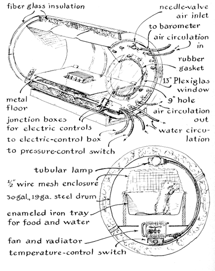 What physiological changes accompany this adaptation and how long do they persist after the individual returns to sea level? To investigate these questions David E. Smucker of Wheaton, Ill., recently undertook for a high school science project to convert a 30-gallon steel drum into a chamber for simulating environments between sea level and 30,000 feet. At simulated altitudes of up to 15,000 feet automatic controls maintain the chamber at any desired air pressure, temperature, relative humidity and concentration of oxygen and carbon dioxide. At higher simulated altitudes the apparatus is controlled manually. A removable disk of clear plastic provides an opening at one end of the chamber for admitting experimental animals. Although the chamber is suitable for the investigation of a broad range of questions related to the effects of high - altitude on small animals, Smucker s experiments were confined to the measurement of changes in the weight and blood of albino rats maintained for a few weeks at a simulated altitude of 10,000 feet. Smucker writes: "There appear to be two schools of thought about the effect of exposing an organism to high altitude. One group holds that organisms exposed to high altitude are strengthened by the experience. They argue, for example, that airplane pilots or astronauts who have become acclimatized to extreme altitudes have a better chance of survival if they later find themselves in thin air. The other group believes that exposure to high altitude is damaging, both physically and mentally. My experiment was not designed to assess an issue of this sophistication, but the results appear to support the latter opinion. I shall describe first the apparatus and then the experiment.