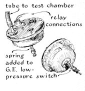 "Air pressure in the chamber is reduced by a refrigerator compressor modified to operate as a vacuum pump [see "The Amateur Scientist," March, 1960]. For manual control the pump is switched on and off when necessary. A valve between the pump and the chamber controls the pumping rate "At simulated altitudes of up to 15,000 feet the pressure can be controlled automatically by a sensitive pressure switch that operates the vacuum pump through a relay salvaged from an automatic record player. The pressure switch is a modified General Electric Type J-1 that employs a bellows for sensing pressure differences. Low pressure is applied to the inside of the bellows, high pressure to the outside. The switch closes when the pressure inside the bellows differs from that on the outside by an amount equivalent to a column of mercury eight millimeters high. "The pressure inside the chamber at an altitude equivalent to that of the atmosphere at 10,000 feet differs from the pressure at sea level by approximately 23 centimeters of mercury. To adapt the switch to this higher pressure I added a helical compression spring that acts against one side of the bellows to oppose the pressure exerted by the atmosphere [see Figure 5]. The opposite end of the spring is seated against a screw for adjusting the pressure exerted by the spring against the bellows. By altering the setting of the screw the switch can be regulated to operate at any chamber pressure through the range from 400 to 760 millimeters of mercury, equivalent to altitudes ranging from sea level to 15,000 feet. "The concentration of carbon dioxide in the chamber is controlled by circulating a portion of the air inside the chamber through sodium hydroxide. Similarly, the concentration of water vapor is controlled by circulating the same portion of air through calcium chloride. The filtering unit that contains these chemicals consists of a 24-inch length of l 1/2-inch, thin-walled electrical conduit plugged at the ends by rubber stoppers perforated for hose connections. Air entering the top of the filter passes through the chemicals and returns from the bottom to the environmental chamber.
