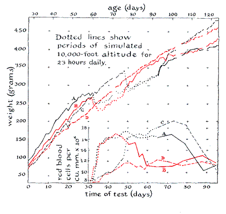 "In general, the experiment proceeded without incident, but one event is worth mentioning because it taught me the importance of maintaining sterile conditions. On the second day of the exposure interval I found mixed among the blood cells protozoa that could not be identified with any organism known to infect rats. After wasting a lot of time examining the animals I checked the Ringer's solution and found that it was swarming with the intruders! Somehow the solution had been contaminated. Data were taken and tabulated every day of the experiment except Christmas Day and three days of the post-exposure period when I was sick. These days are indicated by gaps in the graphs of the results [see illustration below]. "The four animals are identified in the graphs by the letters A, B, C and D. The dotted portion of a curve indicates the interval during which the animal was exposed to high altitude. The larger graph depicts changes in weight; the smaller graph, the results of the red-cell count. During the base, or pre-exposure, interval six animals were housed three to a cage: A, B and C in one cage and, in another, D plus the two lightest rats that were subsequently eliminated. During the 14th day of this period varnish remover was used for refinishing some woodwork in the room where the cages were kept. Evidently the fumes were toxic because all the animals lost weight. During the 19th day the water was removed from the cage of A, B and C to learn if these animals would react alike. All lost weight. During the 30th day A, B and C again lost weight for some reason I could not ascertain. Something may have contaminated the water. "The first red-cell count was taken on the 31st day, just before A and B were exposed to high altitude. Both exposed rats lost weight during the next four days. They became inactive and ate and drank very little. After a week in the chamber they began to adapt to the thin air. Their appetite and vigor returned and they almost regained their normal rate of growth. Their red-cell count increased from less than nine million cells per cubic millimeter to more than 16 million cells in the first seven days. The red-cell count of the controls also increased as expected because red-cell concentration increases as rats age. C's count, however, appeared to increase at a rate somewhat above normal for its age. "On the 50th day B and C were switched: B was returned to normal pressure and C was exposed to high altitude. The result is dramatically apparent on the graph. C's reaction to exposure paralleled that of A and B. After being returned to low altitude B gained weight rapidly and its red-cell count dropped to normal and then below normal. Later it rose to normal. After the 64th day A and C were returned to normal pressure. Their weight increased rapidly. A's red count paralleled that of B, except that it required more time to return to normal, whereas that of C increased instead of decreasing after the animal was returned to normal pressure. It then returned to normal and dipped below. The cell count taken on the 63rd day was just under 18 million cells per cubic millimeter. The experiment was terminated at the end of the 96th day, but the animals were kept for observation of any possible aftereffects of the experience. None has been evident. "Only 65 percent of the oxygen at sea level is available to animals at an altitude of 10,000 feet. This condition appears to induce lethargy for a time and leads to loss of weight until the rats adjust to the thin air in about a week. This adjustment is accompanied by an impressive increase in the concentration of red cells that transport oxygen to the tissues. The subsequent growth of A and B, which were exposed to the chamber when they were much younger than C, has been more retarded than C's. This difference is most evident in A, the animal that was exposed longest. One unavoidable experimental condition-the daily interruption of one hour I when the animals were returned to normal pressure while measurements were made and the cages were serviced -may have influenced the results. The effect of this daily interruption is not known.