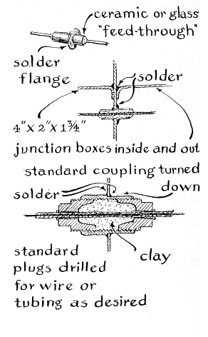"The inner wall of the tube is lined along its upper seven inches with plastic screening made by rolling a strip of screening seven inches wide and 20 inches long into a cylinder. This arrangement permits air not only to flow into the end of the column of sodium hydroxide but also to pass down the inner wall of the pipe and through the side of the chemical. When the screening is not used, water vapor causes a crust to form over the top of the chemical; within 14 hours the crust blocks the flow of air. A short plug of fiber glass at the bottom of the tube prevents chemical dust from entering the environmental chamber. "A separate compressor is used for circulating air through the filter. The motor that powers this compressor is controlled by a timer salvaged from an old stoker. The timing unit can be set for operating the filter once or twice an hour for intervals of up to 15 minutes. "Relative humidity can be increased any desired amount by bubbling a portion of the air through a flask of water. The plumbing connected to this flask is fitted with a bypass valve for regulating the flow of air and hence the relative humidity. A standby compressor-and-valve system allows any of the three compressors to be substituted quickly for either of the other two. In addition all three compressors can be operated in unison as vacuum pumps for lowering the pressure quickly. When they are thus connected, an altitude equivalent to 30,000 feet can be simulated in 2 1/2 minutes. "Electric power is wired into the chamber through airtight, insulated fittings of two types. One consists of a conductor sealed into glass tubing that in turn is sealed inside copper tubing. The copper tubing is soldered into holes in the chamber. Fittings of the second type were made from 1/2- and 3/4-inch pipe couplings. These were machined at one end, fitted into holes in the end of the chamber and soldered in place. Holes that make a close fit with rubber-insulated wire were then drilled axially through a pair of pipe plugs that fit the couplings. One plug of each pair is screwed into the inner end of its coupling. The wire is then threaded through the other plug, placed through the coupling and threaded through the first plug. The space between the plugs is packed with modeling clay and the second plug is screwed in place. When tightened, the assembly makes a good seal.
