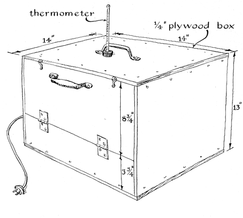 "Some of the required apparatus, such as an incubator, can be constructed at home. I built an incubator of 1/4-inch plywood. It is essentially a box with a hinged door and an electric heater. The dimensions are not critical-any well-constructed cabinet of ample size will do. I joined the plywood rectangles by means of soft-pine corner strips that were fastened by brads and glue. The hinged door opened downward and was held shut by hooks or a magnetic latch of the kind used in kitchen cabinets. The latches, hinges, handles and other cabinet hardware were obtained from one of the large mail-order houses. The incubator was fitted with shelves cut from perforated aluminum of the do-it-yourself type stocked by most hardware dealers. One could substitute 1/4-inchsquare wire mesh of the kind known as hardware cloth if perforated aluminum were not available. "The incubator was heated by five Christmas-tree lamp bulbs of Type No. 46. I installed miniature porcelain sockets for six bulbs but found that five heated the unit adequately. These lamps operate on 6.3 volts and are powered by the filament transformer of an old radio set. The heater assembly was installed in the bottom of the box, as shown in the accompanying illustration [right]. Room temperature did not vary widely, so that I did not equip the incubator with automatic temperature control. If automatic control were needed, it should be easy to improvise. One could substitute a single 60-watt lamp bulb for the miniature lamps and control it by a small thermostat of the kind used in chicken brooders. Such thermostats are listed in farm catalogues of the large mail-order houses for about $5. "When it is used in locations where the temperature varies widely, the incubator should doubtless be insulated. Good insulation would be provided by an inch or so of rock wool in the space between a pair of nested boxes. Alternatively, the incubator could be made of slabs of foam plastic. My completed unit was sanded, painted with enamel and equipped with a door handle and a carrying handle.