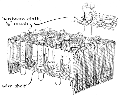 "I also made several other pieces of apparatus: an alcohol lamp (used for sterilizing test tubes), inoculating needles, wire loops for manipulating solutions and a test-tube rack. The lamp consists of a small glass bottle, the neck of which makes a snug fit with a wick of sack cord 3/8 inch in diameter. I have also made lamps out of bottles with larger necks. These were fitted with a perforated cork that in turn fit the wicking. The cork was protected from the flame by a metal washer made of aluminum foil. Incidentally, holes of any desired size can easily be burned through corks by means of a red-hot file tine. "My inoculation needles and wire loops were made of straightened paper clips. The end of each wire was inserted in a six-inch length of six-millimeter soft-glass tubing and the joint was heated in the flame of a Bunsen burner until the materials sealed. Wooden handles would have been as good but they were not as easy to make. A loop about an eighth of an inch in diameter was made at the outer end of some of the wires; this provided a handy device for picking up and transferring a large drop of culture solution. "I was surprised at the number of shallow containers one requires for making these experiments. Initially I bought four Pyrex Petri dishes for 65 cents each. When the project got under way, it became apparent that I would need dozens of them, so I hunted for alternate vessels. Finally I found a source of pre-sterilized Petri dishes made of plastic. They are priced at $7.50 per 100 and are shipped in five sealed packages of 20 each. Eventually I used 250. "Also required are three dozen test tubes approximately half an inch in diameter and five inches long. A rack for holding the test tubes can be made of hardware cloth. Mine measures six inches wide, eight inches long and four inches high. The mesh can be spread enough to accept the tubes. The top and ends of the rack consist of a single piece of mesh six inches wide and 16 inches long. Square bends made four inches from the ends serve as supports for the top. A second piece of mesh of the same width but only 10 inches long forms the bottom shelf of the holder. This nests inside the larger piece when square bends are made one inch from the ends [see illustration above]. Test tubes, stoppered by plugs of absorbent cotton, can be sterilized by being baked for 20 minutes at 300 degrees Fahrenheit in a kitchen oven. "In general, I sterilized glassware in an autoclave-an old pressure cooker my mother had discarded. Six ounces of water was placed in the cooker along with the glassware and heated on the kitchen stove. A steam pressure of 15 pounds per square inch was maintained for 15 minutes to complete the sterilization. Because the pressure cooker was not large enough to take conventional half-liter flasks I used a variety of covered containers-peanut butter jars, fruit jars, jelly jars and so on-for agar preparations and other solutions. "Harmless bacteria and penicillium cultures can be obtained from the American Type Culture Collection, 2112 M Street NW, Washington, D.C. 20036. (Pathogenic bacteria are not distributed to amateurs.) Substantial discounts are given on orders accompanied by documentary proof that the buyer is a student. Agar and related preparations can be procured from distributors such as Difco Laboratories, Detroit, Mich. 48201, and General Biological Supply House, 8200 South Hoyne Avenue, Chicago, Ill. 60620. "In general, I maintained sterile conditions by means of techniques described in this department for March, 1958. I did not use a sterile transfer chamber, however, when manipulating the cultures. If Fleming had used a transfer chamber he might not have discovered penicillin, because the organism appeared on one of his cultures as a contamination. On the other hand, I did not deliberately encourage contamination. Only one culture was spoiled by what appeared to be an airborne organism.
