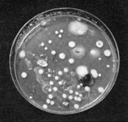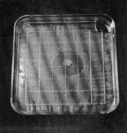 "With that background and encouragement I set up my experiment. My soil specimens were collected from a variety of nearby locations: at the base of an oak tree, from a pine woods, a pecan grove, a sumac thicket and so on. The culture that produced the most organisms came from a meadow. The one that produced the fewest-one-was collected near my house. Yet the organism in this specimen secreted an antibiotic! The specimen that produced the most antibiotics-three-was collected near a fishpond. In all, antibiotic activity was found in six out of 23 specimens-a good batting average in spite of the fact that the six represented only three antibiotics, all of which are well known. "The soil organisms were cultured on several media to encourage growth of the maximum variety. Organisms that grow as colonies were then isolated and subcultured in nutrient broth. The broth was tested for antibiotic activity by saturating a small disk of blotting paper with the solution and placing it on a test culture of bacteria. Activity was indicated by a circular zone surrounding the paper disk in which the growth of the bacteria was inhibited. The width of the zone varies in proportion to the strength of the antibiotic activity. "For test bacteria I used Sarcina lutea, the harmless organism adopted by the National Bureau of Standards for the control of commercial penicillin production. It is easily grown and responds uniformly to the presence of antibiotics.. The zone of inhibition appears to the unaided eye as a clear circle surrounded by the bright yellow of the normal culture [Figure 5] "To familiarize myself with the procedure I first made up a culture of Sarcina lutea and exposed it to several commercially prepared antibiotics. Small disks of blotting paper cut with a paper punch were moistened with drug solutions and placed on the plates of agar nutrient that had been freshly inoculated with Sarcina lutea. I had procured a culture of pure Penicillium notatum and cultivated it on nutrient broth under the same conditions I planned to use for culturing soil organisms. Blotting paper saturated with this broth was also tested on a nutrient agar plate of the Sarcina lutea. The resulting zones of inhibition varied from one to eight millimeters in width; the average was three millimeters.
