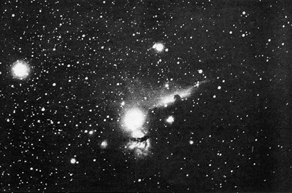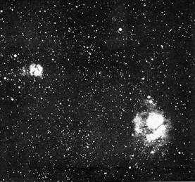 "My interest in observational astronomy," Little writes, "began about five years ago when I acquired a 10-inch reflecting telescope. After a few months, when the thrill of 'just looking' began to pall, I fitted the telescope with a plateholder so that I could try deep-sky photography. This proved disappointing. My successes averaged about 1 percent of my tries, even when I set up the apparatus far beyond the range of city lights. Wind was my big enemy. A gentle breeze can vibrate the tube of a long telescope enough to destroy the sharpness of the photographic image. In addition I learned that big telescopes are difficult to move and to set up at distant locations. "Such problems disappeared when I acquired my Questar, which is a miniature telescope weighing only seven pounds. It has an electric motor for tracking, or rotating the lens system in step with the apparent motion of the stars. To power the motor in the field I constructed a variable-frequency oscillator that operates from the storage battery of my car. This device enables me to guide the telescope-that is, keep it locked onto a desired star by changing the frequency of the oscillator [see "The Amateur Scientist," October, 1959]. A set of brackets was improvised for attaching the 35-mm. cameras to the tube of the telescope. I also made a set of illuminated cross hairs for the eyepiece. To make a photograph of the sky I center a selected star on the cross hairs and then adjust the frequency of the oscillator to keep the star in position as long as the shutters of the cameras are open. "The beauty of the equipment is in its compactness, solidity and ease of transportation and use. I have photographed deep-sky objects in winds up to 20 knots without adverse effects. I am always able to work from a comfortable sitting position. As many as 20 photographs of deep-sky objects have been made during the course of a single night. "Experience has taught me a few basic rules for those who may be inclined to try this hobby. First, exposure time must be determined experimentally. Exposures that are reported by others can be grossly misleading. Many amateurs, for example, report exposures of one hour 45 minutes at a lens opening of f/5 for the Horsehead Nebula in Orion. My photograph of this formation was made in 30 minutes at f/5 [see Figure 1]. Long exposures tend to emphasize guiding errors-that is, to allow the movement of star images with respect to the film. Excessive exposure time also permits scattered light from the sky to fog the film and degrade the contrast of the image. My best photographs have been made with Eastman Kodak Spectrographic film Type 103 aE. My second preference is Tri-X.