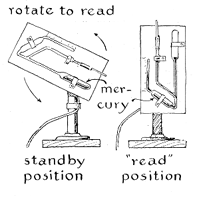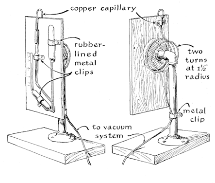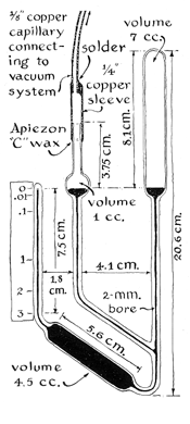 Some metals tend to sputter more readily than others. The destructive action can be minimized by coating electrodes with a metal such as barium that increases conductivity in the vicinity of the electrode, thereby lowering the velocity of the ions in the plasma and the consequences of their impact on the metal. Coated electrodes must be purged of the occluded gases when the tube is constructed. This is usually done by operating the tube for a time on current intense enough to heat the meta I to redness. I omitted the step during my initial construction in an attempt to minimize the cost of the project. By trial and error I found that electrodes of aluminum foil resist erosion without having to be heated. The oxide coating naturally present on aluminum appears to retard the sputtering action for as long as 50 hours of operation if all other conditions are favorable. Sputtering appears to be accelerated by a trace of almost any organic vapor. This became evident from the operation of the manometer I used originally for measuring gas pressure. The instrument employed phthalate as the indicating fluid. The vapor passed readily through a trap refrigerated by a slurry of dry ice and acetone and eventually contaminated the entire vacuum system. From then on even aluminum electrodes sputtered severely after an hour of operation, and no tube gave as many as five hours of service. The difficulty was overcome by substituting for the manometer a gauge of the McLeod type, which uses mercury as the indicating fluid. The version of the gauge that I made consists of three joined capillary tubes, each of which contains a bulb [see Figure 5 ]. One bulb terminates in a closed capillary about 7.5 centimeters long. The middle leg contains a small spherical bulb that is connected to the vacuum system by means of a coil of copper tubing. The third leg terminates in a bulb substantially larger than the other two.