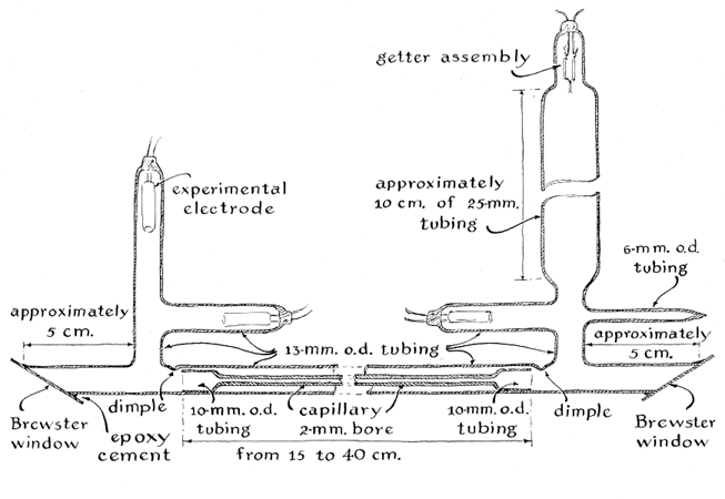 The glass structure is supported on a fixture improvised of plywood and pipe fittings that allows the assembly to be rotated through an angle of about 100 degrees for transferring the mercury by gravity from the largest bulb, in which it is stored, to the other two legs of the gauge. Normally the gauge is kept in the standby position with the mercury in the large bulb. To make a reading the assembly is rotated to the upright position This causes the mercury to run into the other legs. A specimen of the gas under measurement is trapped and compressed in the closed capillary, limiting the height to which the mercury can rise in the tube. When the system is fully exhausted, mercury rises to the top of the closed capillary, indicating zero pressure. Simultaneously the metal rises to the same level in the bulb of the middle leg as well as in the reservoir. When the system is not fully exhausted, compressed gas prevents the mercury from rising to the end of the closed capillary. The distance between the closed end and the meniscus, or curved top, of the mercury is a measure of the pressure. In effect the gauge acts as a closed-end manometer. A vertical scale, plotted in torr, is adjacent to the closed capillary, the zero graduation coinciding with the closed end. Graduations representing higher pressures are plotted at appropriate distances below the zero graduation. Only two quantities must be determined to compute the locations of the graduations: (1) the volume of the closed capillary plus the volume of the bulb to which it is attached and the volume of the capillary that connects this bulb to the middle leg of the gauge, (2) the cross-sectional area of the closed capillary. To measure the volume, first weigh the glassware (to a tenth of a gram), then fill the volume to be determined with mercury and weigh it again. Subtract the weight of the glass from that of the glass and the mercury combined to determine the net weight of the mercury. Divide the net weight of the mercury by .0135 to determine the volume of the glassware in cubic millimeters. The cross-sectional area of a two-millimeter capillary is approximately three square millimeters. To determine the distance in millimeters at which mercury will stand below the zero graduation for any pressure first multiply the volume just measured by the given pressure. Then divide this product by the cross-sectional area of the closed capillary. The square root of this quotient is equal to the distance in millimeters. For example, assume that the position of the graduation is desired for a pressure of 1.5 torr, that the volume of the closed capillary and its associated bulb and connecting tubing is 4,500 cubic millimeters and that the cross-sectional area of the. closed capillary is three square millimeters. The distance between the zero graduation and the desired graduation is then equal to the square root of 1.5 x 4,500/3, or 47.4 millimeters. To compute the entire scale, make a list of selected pressure intervals, such as .1, .5, 1, 1.5 and so on, and do the arithmetic. Plot the resulting distances in millimeters as graduations on a cardboard scale and cement it to the closed capillary with the zero indication adjacent to the closed end. If the volume of the closed capillary, its associated bulb and connecting tubing is approximately 4,500 cubic millimeters, a 75-millimeter scale will span the range of pressure from zero to three torr. Helium-neon lasers operate within this range. The useful life of the amplifier tube is also reduced by the release of gases naturally present in the metal of the electrodes. Such gases can be dislodged by repeatedly filling the tube with the helium-neon mixture to a pressure of a torr or so and energizing it with an alternating current of 18 milliamperes, the rated output of the neon-sign transformer from which the tube operates. This is a time-consuming business, however. I now use direct current at 120 milliamperes for heating, and thus driving the gas out of, electrodes of metals other than aluminum. The current is supplied by a General Electric constantcurrent transformer (Model 916Y11) that develops 15,000 volts at 60 milliamperes. The unit is energized from the 120-volt power line through a variablevoltage transformer. The secondary of the constant-current transformer is tapped at the center of the secondary winding and grounded to the case by the manufacturer. The output of the secondary is converted to direct current by a conventional full-wave rectifier circuit that employs silicon diodes. To outgas the electrodes the amplifier is first filled with about three torr of the helium-neon mixture. Power is then applied. The discharge current is gradually increased from minimum to 120 milliamperes during an interval of about 30 seconds. Ion bombardment heats the cathode to redness and the released gases change the color of the plasma from red to blue. Power is then shut off and the tube is pumped down. The procedure is repeated until the electrode is fully outgassed, that is, until the plasma retains its red color. The polarity is reversed for similarly processing the second electrode. Getters are assembled in a sidearm that serves as a reservoir for stabilizing the pressure of the gas. The glass of the reservoir and inner wall of the envelope of the amplifier tube is outgassed by initiating a discharge on alternating current at 18 milliamperes between the getters and the electrodes. I am now experimenting with iron electrodes in the form of a cylinder, the inner wall of which is coated with barium strontium carbonate, and also with similar electrodes of titanium foil. The titanium is coated by evaporating barium inside the cylinder from a conventional getter of the KIC type. Tubes with coated electrodes of iron have operated from 50 hours to more than 100. Thereafter they can be reconditioned. (Coated-iron electrodes, barium getters, McLeod gauges and other supplies for experimenting with helium-neon lasers 