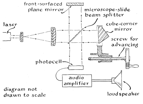 While Robert Little was learning how to make deep-sky photographs the editor of this department was spending most of his free time experimenting with the helium-neon laser previously described here [September, 1964]. Lasers of this type are in effect electromagnetic oscillators. Essentially they consist of an amplifier tube and a resonant cavity. They emit continuous beams of intense coherent light at 6,328 angstrom units and open new experimental opportunities for amateurs in several disciplines. My own interest in recent months has centered on improving the performance of the apparatus- particularly by increasing the useful life of the amplifier tube-without substantially increasing the cost over that of the unit I had originally constructed. The amplifying portion of my apparatus consists of a straight gas-discharge tube, equipped with cold electrodes, that contains a mixture of helium and neon in the ratio of seven to one at a pressure of 1.8 to 2.7 torr, depending on the diameter of the tube. The ends of the tube are closed by plane windows set at an angle equal to the trigonometric cotangent of the index of refraction of the window material, which may consist of any clear pure glass or of fused quartz. The windows are attached to the tube by epoxy cement. The resonant cavity consists of a pair of dielectric mirrors of spherical curvature mounted to face each other at a distance equal to approximately 95 percent of their radius of curvature and adjusted so that their optical axes coincide. The amplifier tube is positioned coaxially between the mirrors. When an electric field of sufficient potential to ionize the gas is applied to the electrodes, excited atoms of helium collide with and transfer energy to the neon atoms, raising the neon atoms to one or another of their higher energy levels. Subsequently the neon atoms spontaneously drop to one or another of the lower energy levels they naturally occupy and simultaneously emit light of the wavelength that is characteristic of the energy released. Some transitions occur between the levels that give rise to emission at the wavelength of 6,328 angstroms.