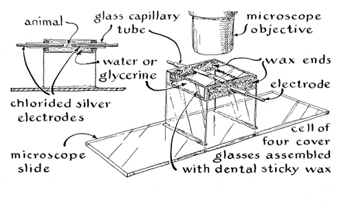 "Various arrangements were also tried that involved placing conducting wires and foils at the sides of microscope slides and cover slips. Most were insensitive because of the large separation of the electrodes. Electrodes in the form of foil strips cemented to the microscope slide proved to be sensitive to vibration and hence acted as generators of noise. "The most successful and generally useful electrodes finally devised consist of silver wires thrust into the ends of a glass capillary tube with a bore about two millimeters in diameter. The tube is supported in water in a glass cell made of cover slips. The assembly is mounted on a microscope slide. The glass cell, capillary tube and slide are attached with sticky wax [see Figure 1]. "The specimen occupies the space between the ends of the wires inside the capillary. To improve the chemical stability of the electrodes the inner ends of the silver wires are cleaned, connected to a l 1/2-volt dry-cell battery and immersed for about 15 minutes in a solution of approximately one part of hydrochloric acid to 25 parts of distilled water. The polarity of the electrodes is then reversed and, with the wires still immersed in the dilute acid, the current is applied for another 15 minutes. Incidentally, cover slips can be broken into particular shapes and dimensions easily if they are first scored lightly with a diamond point.