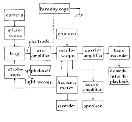 "Although this electrode configuration has resulted in a number of satisfactory recordings, I am still trying to improve it. At present, for example, I am placing thin-film gold electrodes on microscope slides by evaporating the metal in a vacuum. This arrangement has developed exceptionally strong signals. I also plan to use half-silvered slides. With the animal between two transparent but electrically conducting slides the whole problem of simultaneously achieving large surface area and good visibility may be solved. "The opportunity to experiment with the thin-film packages intended for use as integrated circuits is also tempting. Some of these devices have as many as 10 miniature electrodes that terminate in an area of only a few square millimeters [see "Microelectronics," by William C. Hittinger and Morgan Sparks; SCIENTIFIC AMERICAN, November, I965]. This area could be flooded with solution and sealed with a cover slip. Rejects are fairly easy to procure. Unwanted circuits can be etched off the assemblies with the combination of concentrated nitric and hydrofluoric acid that is designated by the code number CP-8. "In general the instruments used for amplifying and displaying the signal operate in two groups. The group inside the shielded box includes the specimen cell, microscope, camera, strobe lamp, photocell and preamplifier. The unshielded group consists of the oscilloscope and an associated camera for photographing the display; a frequency meter, a pen recorder, a loudspeaker and an associated audio amplifier; a carrier amplifier that feeds a 400-cycle current modulated by the signal to a magnetic tape recorder, and a demodulator for recovering the signal. The carrier is necessary because my tape recorder does not respond to frequencies as low as those of the signal.