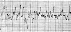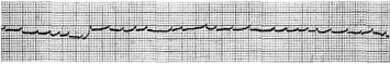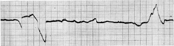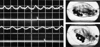 "The eyepiece of the microscope is accessible for viewing the specimen without opening the shielded box. When the strobe lamp is flashed for making a photomicrograph of the specimen, the photocell picks up the light and transmits a voltage pulse to the oscilloscope and the recorders. The pulse appears as a timing mark on all displays and correlates the position of all visible parts of the specimen with the electrical potentials present at the instant the picture is made. "It is rather easier, I find, to gather the data than to interpret it. I have recorded and definitely identified electrocardiograms of Daphnia [see Figure 7]. The graph of individual beats is roughly similar in shape to the discharge of a single cell. The large pulse on the left side of the record may have been caused by a twitch of the water flea's antennae, although I was not watching the animal when this feature appeared. The pulse rate of Daphnia is about 600 beats per minute. On the other hand, the animal's heart occasionally stops and then resumes beating. The reason for this is puzzling unless the pause serves as an interval of rest and recovery. "Respiration is likewise interrupted from time to time. Its frequency varies in such a way as to suggest that something is acting as a feedback mechanism, but I have no idea what the mechanism could be. The accompanying illustrations [right] show respiration potentials at two intervals. The vertical lines on both graphs represent time intervals of .2 second per centimeter and the horizontal lines indicate signal potentials of 200 millionths of a volt per centimeter. The straight graphs below each contain a timing 'pip' that registers as an upward excursion of the pen at the instant the photomicrographs are made. The upper and lower pictures correspond respectively to the top and bottom graphs. The eye of this female specimen appears at the extreme right and the brood pouch, containing seven eggs, is at lower left. The faint, fuzzy object immediately to the right of the eggs is the heart. The respiration rate of this specimen varied from a high of 270 per minute (as shown by the upper graph) to approximately 210 per minute (as shown by the second recording). The signal strength averages about 80 millionths of a volt in both. "When respiration and pulse are suspended at the same time, it is possible to make a clear recording of Daphnia's antenna movements Each movement occupies only about 20 thousandths of a second on the average. Graphs of respiration and pulse that occur simultaneously are not particularly meaningful, but an example is included. "I have devoted far more time to the study of Daphnia than to other organisms, although recordings of several other animals have been made. The antenna movements of the water flea Cyclops, an organism responsible for transmitting worm infections to humans, generates action potentials that closely resemble those of Daphnia [see Figure 10]. Ostracods, on the other hand, make recordings of action potentials that appear to be associated with muscle twitches [Figure 11]. These organisms are enclosed by a pair of opaque shells that make it difficult to associate an action potential with the functioning of a specific organ. "My electrocardiograms of mosquito larvae are cluttered somewhat by 'noise' generated by other muscle. These disturbances could doubtless be minimized by situating the animal with respect to the electrodes in a position that would emphasize its heart action. This would require more patience than I have yet summoned. Even so, the heartbeats are obvious on the graph and easy to count. The accompanying graph [see bottom illustration above] is relatively uncluttered by muscle noise, The pulse rate averages approximately 360 beats per minute. "Although action potentials of several protozoans have been detected, I have not yet succeeded in making recordings worthy of publication. The technical difficulties of recording bioelectric potentials seem to vary inversely with the size of the animal. Potentials have been recorded from a paramecium when it collides with an object, stops and changes direction. The graph shows merely a spike, or pulse. An electrode assembly of greater sensitivity would doubtless deliver the continuous signal that according to theory must be present in the water. "Impulses have also been detected from colonies of vorticellae. This animal resembles a minute, inverted bell equipped with a slender handle or stalk by which it is normally attached to bottom sediments. A muscle-like fibril spirals down the stalk. When the fibril is stimulated, it contracts violently, jerking the entire organism downward to the base of the stalk. The pulses I detected appear to be associated with these abrupt contractions, but my colony gave out before I could verify the effect, much less analyze it. "In performing these experiments I have had a lot of help and encouragement from fellow members of our Amateur Research Center, Inc., a group of science enthusiasts some of whom live as far away as Berkeley and San Jose, a distance of about 60 miles. We have assembled a collection of instruments that are available to members on loan. In addition we hold regular seminars and publish a modest bulletin that reports our activities both as individuals and as a group. We plan to expand our facilities, and we hope to set up a program that will enable specially qualified amateurs to work at the center during summer months while holding part-time jobs that we would help to find in local industry. We welcome new members, even from across the country, and encourage the organization of similar groups everywhere. Our group is sponsored by the American Society of Safety Engineers. We shall be glad to correspond with anyone who would like to know more about our activity. Our address is: Amateur Research Center, Inc., Box 2337, Stanford University, Stanford, Calif. 94305."