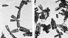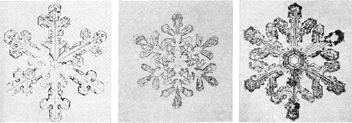 "Just as it is possible to use solvents other than ethylene dichloride, so one can use plastics other than polyvinyl formal. Among the alternatives are polystyrene and methyl methacrylate. Polystyrene is readily available as Styrofoam. Polymerized methyl methacrylate is commonly known as Plexiglas. Scraps of Plexiglas reduced to granules by means of a wood rasp dissolve readily. Both materials are soluble in either ethylene dichloride or chloroform. "A number of procedures have been devised for making replicas. One of the simplest calls for the plastic solution to be stored in a squeeze bottle made of polyethylene and kept below the freezing temperature of water. Enough solution is squirted onto a cooled glass slide to wet the upper surface. The slide is exposed to falling snow in order to collect specimens on the wet surface and is then placed in a cold, ventilated area for drying. The characteristic odor of the solvent becomes less apparent as the slide dries. When the odor can no longer be detected, the replica is ready for use. The best results are obtained when the slide is kept well below 0 degrees C. until the plastic hardens. Hardening may require some hours even in a well-ventilated area. Water molecules of the specimen migrate through the plastic film without difficulty. "The most beautiful snowflakes occur in three basic forms: hexagonal plates imprinted with symmetrical designs, triangular plates and six-pointed stars with lacelike branches. Surprisingly, few storms produce perfect crystals of these types in substantial quantity. The dendritic stellar forms usually appear in large numbers during gentle snowfalls on cold, still nights. "The platelike crystals, both hexagonal and triangular, appear to originate in high clouds. Six-pointed stars of simple design often form at altitudes of 1,000 feet or less. Elaborately ornamented crystals of the stellar type most often fall from clouds of intermediate height-the crystals of greatest complexity appearing when the weather is mild. The crystals comprising diamond dust are so small that they require many hours to fall a few thousand feet. Most of them sublime on the way. For this reason it appears that these minute particles form close to the ground. Snowstorms of the most common type produce clusters of flakes in random array that contain few symmetrical crystals and range in diameter from a few millimeters to several centimeters. "Nicely formed crystals can be caught on a sheet of black velvet (black for ease of visibility and velvet for ease of handling) that is exposed to the fall for a few seconds and then examined in a cold, sheltered location such as an unheated shed, garage or tent. Specimens can be lifted from the velvet easily with a toothpick that has a small drop of 1 percent replica solution on the tip. The drop of solution can be collected on the tip by dipping the wood into the solution and withdrawing it quickly. The bottom of the suspended drop is then quickly but gently applied to the center of the specimen. Surface tension will lift the crystal from the velvet. Care must be taken not to press the wooden tip against the specimen or the crystal may be broken. "The crystal is then transferred to the wet slide. Surface tension exerted by the large area of fluid now in contact with the bottom of the crystal will pull the specimen away from the wooden point. It will promptly sink into the film on the slide. As many as 20 crystals can be so arranged on a two-inch cover glass of the type used for making 35-millimeter projection slides. Once prepared, replicas can be covered by a second glass fastened in place with binding tape for optical projection, photographic enlargement or microscopic examination.