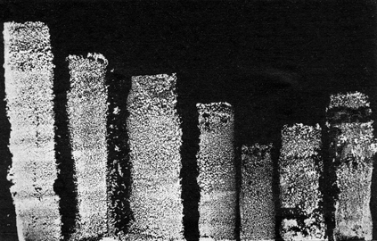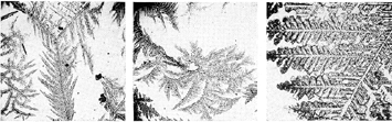 "Base materials other than glass can be used. Replicas show up nicely on black cardboard, for example. I have also used sheets of polyethylene, which are easy to cut into strips of the desired size. The thin transparent plastics such as Saran Wrap can serve as flexible mountings. They are easy to handle when they are supported by a frame such as: an embroidery hoop. "To speed up the drying of replicas I have frequently made precoated slides. The base material is dipped into or otherwise coated with a replica solution of the required concentration and dried. The precoated surface is then moistened uniformly with solvent and charged with specimens. The coating dissolves in the immediate vicinity of the snowflakes. Much of the excess solvent is soaked up by the surrounding film. Because of surface attraction every nook and cranny of the specimen acquires a thin plastic coating. Some of my most successful replicas have been made by this procedure. "Crystals smaller than one millimeter in diameter, such as 'diamond dust,' can be replicated most successfully by a variation of the precoated-slide technique. After the crystals have come to rest on the dry coating the slide is exposed to the vapor of the solvent, either ethylene dichloride or chloroform. (A vapor chamber for exposing slides can be improvised from a small wooden box equipped with an airtight lid. A shallow dish of solvent placed on the bottom of the chamber provides the vapor; a slit in the side of the box that slide.) The vapor condenses as a thin film on the coating but tends to accumulate around each specimen. There it dissolves the plastic locally and by a combination of surface tension and capillary effects coats the snowflakes in three dimensions. "Another convenient technique makes use of the clear lacquer solutions now commercially available in aerosol-spray cans. Snowflakes that have collected on a base material are simply sprayed with the solution. The method is particularly useful for replicating frost on windowpanes. For best results the spray can should be held far enough away so that the plastic is almost dry when it makes contact with the crystals. The optimum distance varies with the drying time of the spray and must be determined by experiment. Krylon, an aerosol lacquer available from dealers in paint and art supplies, is particularly effective for this technique. "Replication experiments need not be limited to small crystals and frost. For example, interesting and useful records of snow accumulations on the ground can be compiled by making daily replicas during a period of a week or more. For the base I use a sheet of window glass as wide as the snow is deep and from 15 to 20 inches or more in length, depending on the desired number of replicas. I apply a vertical strip of 5 percent solution about two inches wide at one end of the glass and press the glass gently against a vertical cut in the snow layer. The glass is then removed, along with the adhering film of snow, and placed with the replica side up in a cold, sheltered place. The plastic will dry within 24 hours and the film of snow will have sublimated. At approximately the same hour on succeeding days additional strips, each adjacent to its predecessor, are similarly applied to the glass and the replicating procedure is repeated. The series provides a sequential account of the gradual consolidation of snow by recrystallization even when the temperature remains well below freezing through the entire period of observation. Such effects as the gradual disappearance of layering that is always evident in fresh falls and the conversion of light flakes into 'corn' snow of relatively high density become strikingly evident in the record. "Replicas can also be made of the structure of bulk ice, much as the crystalline pattern in metals is revealed by polishing and etching techniques. Experiments of this kind can be made even in summer in locations where hailstones fall. In fact, any kind of ice can be used: an icicle from the edge of a roof, a small piece of ice from a pond or stream or even an ice cube from the refrigerator. Whatever the specimen, the ice should be kept well below freezing temperature. If necessary, place the specimen in the freezing compartment of a refrigerator for a few hours. Begin the procedure by cutting a piece of plastic foam about the size of the specimen. This will be used as a handle to insulate the specimen from heat. To attach the handle, make a reasonably flat surface on the specimen by sawing or otherwise cutting off any roughness. Then spread a bit of water on the plastic foam and apply the wet surface to the flattened ice. The water will promptly freeze, cementing the handle to the specimen. "Next, heat an electric iron or other flat metal object until it is warm to the touch. Press the specimen against the warm iron until the ice melts enough to form a flat surface. Immediately wipe the surface dry with a soft cloth. The temperature of the specimen will have risen substantially. Return it to the freezing compartment for an hour or so. "Cover one surface of a flat board about 10 inches square with a piece of velvet stretched tight and securely tacked at the edges. The velvet will serve as a polishing buff. Remove the cooled ice from the freezing compartment and, manipulating the specimen by the handle, rub the flattened surface of the ice briskly across the velvet until it acquires a polished surface. The polishing operation requires only a minute or so. Then store the specimen in a cold, dry atmosphere for etching. The crystalline pattern will appear in a matter of minutes. Etch pits, marking crystal boundaries in the ice, are formed by sublimation. They stand out clearly as differences in the intensity of reflected light. Etching by sublimation requires that both the ice and the atmosphere be dry. Otherwise frost may form on the specimen and spoil the experiment. "To replicate the etched surface, cover the polished area with a f