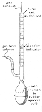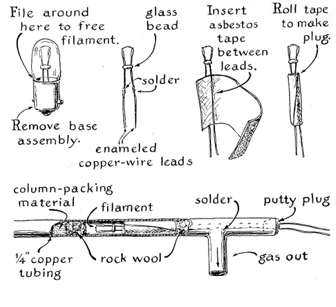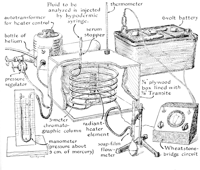 The T connection at the exhaust end of the column leads to an ingenious flowmeter suggested to Langhoff and Martin by Don F. Weinhart, professor of chemistry at the University of Oregon. The device consists of a glass tube calibrated in milliliters and fitted at the lower end by a side arm for admitting gas and by a rubber squeeze bulb partly filled with soap solution [see Figure 4]. Squeezing the bulb deposits a soap film across the calibrated tube. The soap film is then forced up the tube by gas entering the side arm from the chromatographic column. By timing the passage of the soap film along the graduations the rate of flow in milliliters per minute is easily calculated. The flowmeter was made of a broken buret by cutting off the jagged top, sealing in a side arm at the bottom and pulling the soft glass beyond the side arm into a taper that fits the squeeze bulb. "The oven is simply a plywood box of convenient size lined with Transite and insulated with rock wool. The construction is not critical because the column operates at a temperature of only 130 degrees centigrade. (The temperature of the column need be only high enough to vaporize the specimen, in this case white gasoline.) Heat is supplied by a 600-watt unit from a radian electric heater. The temperature controlled by energizing the heated through a variable autotransformer. The essential element of the detector is the filament assembly of a 6.3-volt 25-ampere incandescent lamp of the type used in a four-cell flashlight. Such bulbs are available in most hardware stores. The filament is removed from the lamp by filing a nick completely around the bulb at the point where the glass joins the metal base. Score the glass with a corner of a fine, sharp file. Use light pressure, not more than five ounces. Having extended the nick completely around the envelope, keep filing until the glass cracks. Do not grow impatient and strike the bulb if it fails to break when you think it should. Avoid striking and thus bending the filament assembly when the glass falls away. Without removing the filament assembly from its base, extend the filament leads by soldering a pair of 24-gauge copper wires about six inches long to the leads just below the glass bead that supports the filament. Use a good liquid soldering flux. Clip off the portion of the filament leads just below the soldered joints and remove the filament from the base. A new base is made by spiraling asbestos tape between the leads and winding it into a cylinder as illustrated above. The assembly is then slipped into the discharge end of the column. Measure carefully the distance between the end of the tube and the wad of rock wool that retains the packing. Slide the filament assembly into the tubing just far enough so that a space of about a quarter of an inch remains between the filament and the rock wool. Before installing the filament assembly try it for size in a short length of the copper tubing and simultaneously adjust the leads to prevent contact between the filament and the tubing. When all is ready, slide the assembly into the column, brace the rear of the asbestos base with a tuft of rock wool and secure the leads in place with a plug of putty. The Wheatstone bridge can consist of composition resistors of half-watt size. Never apply voltage to the bridge until air in the chromatographic column has been displaced by carrier gas. The filament will burn out if it is heated to incandescence in air. Use a fully charged storage battery for energizing the bridge, because accuracy of analysis requires constant voltage across the filament. To analyze a specimen of white gasoline turn on the heater and adjust the autotransformer until the temperature of the oven remains constant at 130 degrees C. for 30 minutes. When the temperature has stabilized, turn on the carrier gas and adjust the regulator to a pressure of nine centimeters as indicated by the manometer. After about a minute test the system to see if the carrier gas has displaced air from the column. One makes this test by holding a lighted match or a glowing splint immediately above the discharge end of the flowmeter. If the gas quenches the flame, the probability is that the system has filled with helium. Close the switches that connect the two-ohm and 22-ohm resistors across the microammeter of the Wheatstone bridge. (Incidentally, the most sensitive microammeter available should be used-in the bridge, preferably one that requires not more than 50 microamperes for full-scale deflection.) Now clip the power leads to the battery and adjust the potentiometer in the arm of the bridge opposite the filament until the microammeter indicates minimum current. The resistance of the potentiometer at this setting should approximate that of the heated filament. The setting of this potentiometer should need no additional adjustment. The fine adjustment is made by altering the setting of the potentiometer that is connected between the 22-ohm arms of the bridge. This is the lower potentiometer in the accompanying illustration in Figure 6. The switches that connect the two-ohm and 22-ohm protective resistors across the meter should be closed during the initial adjustments. As balance is approached the two-ohm resistor is cut out of the circuit. This usually increases the excursion of the meter. When the excursion has been minimized by further adjustment of the potentiometer, the 22-ohm resistor is cut out, after which the bridge is balanced as completely as possible. The temperature of the oven, the pressure of the carrier gas and the rate of carrier-gas flow are then measured and recorded. Incidentally, by dividing the known volume of the column by the rate of flow of the carrier gas the interval required for displacing air with inert gas can be found. This is the interval between the time the carrier gas is turned on and the time voltage can be safely applied to the bridge. Finally, about a twenty-fifth of a milliliter of clear gasoline 
