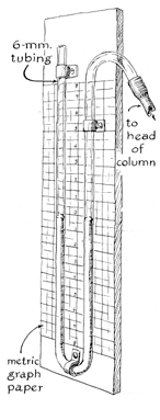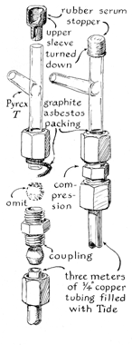 An introductory experiment in gas chromatography conducted last year by Steve Langhoff and Glen Martin, who were then seniors at the South Salem High School in Salem, Ore., illustrates the procedure. Langhoff and Martin's instrument is properly known as a "vapor phase" chromatograph because the specimen (white gasoline), which exists as a fluid at room temperature, must for analysis be converted to vapor by heating the chromatographic column. The envelope of this column consists of copper tubing eight feet long and a quarter of an inch in outside diameter. A short T connection was first soldered into the discharge end of the tube. The space just beyond the T was packed with a plug of rock wool about half an inch long. The tubing was then suspended vertically, with the T at the bottom, and completely filled with the commercial detergent Tide. The granules were slowly poured into the tube through a small funnel and packed by holding a vibrator against the metal. When solidly packed, the tube was wrapped around a cylindrical form to make a coil six inches in diameter, a convenient size for use in an oven improvised of plywood, Transite and an electrical heating element of the radiant type [see Figure 1]. The carrier gas for the system was helium, which Langhoff and Martin obtained from a local welding shop. A regulator of the diaphragm type maintains the pressure of the carrier gas at nine centimeters of mercury, which is equivalent to 1.6 pounds per square inch. Carrier gas enters the column through the leg of a glass T. One end of the crossarm of the T is closed by a plastic cap of the kind used for sealing biological preparations such as serum in bottles. The other end of the T is attached to the column through a compression coupling as illustrated in Figure 2. The space in the copper tube between the granules of detergent and the compression coupling is plugged with a wad of rock wool. A second T fitting that is inserted in the hose connection between the pressure regulator and the column connects to the mercury manometer used for observing the input pressure of the carrier gas.
