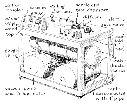 "After passing through the enlarged channel the stream flows through a duct of constant area. This is the test section, where models are mounted. From the test section the stream enters another channel known as the diffuser, which conducts the spent air away from the test section without distorting the flow pattern. A quick-acting valve between the diffuser and the tank seals off the system during pumpdown. "The size of the installation is determined by its intended use as well as by the available space and power. My installation had to be portable because I wanted to enter it in the science fair. The power had to be taken from an ordinary 110-volt outlet fused for 15 amperes. This was adequate for operating a motor rated at 1/4 horsepower. In 30 minutes a motor of this size can store enough energy to operate a supersonic tunnel with an area of half a square inch for about three seconds at a stream velocity of 1,500 miles per hour. That is about twice the speed of sound. My apparatus is assembled in a table-like framework, supported by casters, that is 30 inches wide, 30 inches high and 48 inches long. It can be wheeled through most doors.