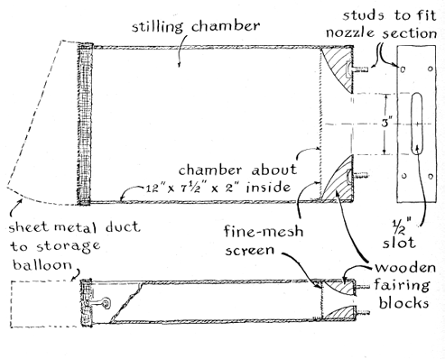 "The profile of my nozzle was supplied by R. W. Hensel of the Arnold Engineering Development Center in Tullahoma, Tenn. The dimensions of the profile are shown in the accompanying illustration [Figure 6]. The nozzle develops an airstream velocity of Mach 2 when the tanks have been exhausted to a pressure of 38 centimeters of mercury or less. In small indraft tunnels the upper limit of velocity is about Mach 3, according to authorities with whom I have discussed the matter. The density of the air decreases with increasing Mach number. Above Mach 3 the air is too thin for observing flow patterns optically. Below Mach 2 it is difficult to maintain supersonic flow with a model of reasonable size. "The top and bottom of my nozzle and test section were made of a pair of aluminum blocks half an inch thick. The blocks were first clamped together. The profile was then cut in both blocks simultaneously by drawing a rattail file across the metal from front to back. The contour was checked periodically with a template cut from thin sheet metal. The filed surface was smoothed with successively finer grades of emery cloth and finally polished to a mirror-like finish with crocus cloth. "One cannot take too much care at this point in the construction, because the performance of the tunnel will be no better than the accuracy with which the finished blocks conform to the specified profile. The blocks are assembled with the contoured edges facing each other to form a symmetrical duct and are fastened together by metal bezels, or frames, that also hold the plate glass walls. Flanges for bolting the unit between the diffuser and the stilling chamber were welded to the metal side walls that enclose the blocks. "Air enters the nozzle-block assembly through the stilling chamber, where turbulence is suppressed by 50-mesh wire cloth at each end of the cavity. Wire cloth for this purpose can be obtained from the Cambridge Wire Cloth Co., Cambridge, Md. 21613. Air must be dried before it enters the stilling chamber or condensation will occur when heat is lost during expansion of the air. I dry the air by means of an apparatus consisting of a small motor-driven blower, a cardboard mailing tube packed with silica gel and a storage reservoir. My storage reservoir is a surplus weather balloon, obtainable from the Edmund Scientific Co., Barrington, N.J. 08007. The blower forces air through the mailing tube, where moisture is absorbed by the silica gel; the air then passes into the balloon for storage. A flange, cemented into an opening I made in the side of the balloon, connects to a duct through which the dry air flows to the stilling chamber. A gate valve I improvised from sheet metal closes the neck of the balloon after it has been filled. "The stilling chamber can be made of wood. Fairing blocks should be inserted at the outlet end of the chamber to guide the air smoothly into the nozzle. Neither the curvature nor the finish of the blocks is critical, as it is in the nozzle-test-section assembly. My stilling chamber was made of 16-gauge sheet metal and faired with blocks of lightly sanded and varnished wood.