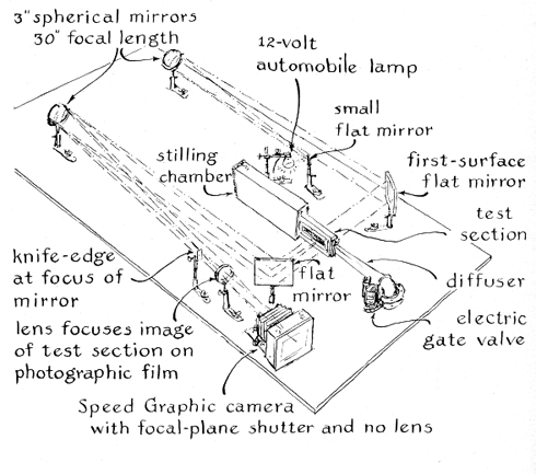 "In view of these considerations I decided to construct a small tunnel of the indraft type for intermittent operation. Small tunnels operate well if they are made aerodynamically 'clean,' that is, if sharp turns are avoided and obstructions such as rough walls are eliminated in the duct through which the air flows. My tunnel consists of eight elements: a $2 drier, a stilling chamber, a nozzle, a test section, a diffuser, a vacuum tank, a pumping system and a schlieren apparatus for photographing the flow of air around the model [see Figure 3]. "Air at atmospheric pressure enters the nozzle through the drier and stilling chamber, which are designed to remove moisture and to accelerate the flow smoothly. Specially shaped blocks in the nozzle first constrict the entering stream of air and then allow it to expand. In this arrangement the air is accelerated to the speed of sound at the point where the blocks constrict the channel to minimum area. Immediately downstream from this point the channel becomes larger. The air expands and so is further accelerated to supersonic velocity.