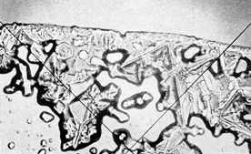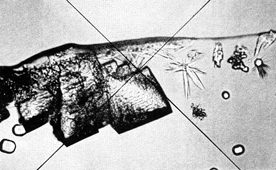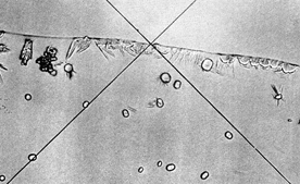 "Now we come to the study with which I have been lately amusing myself. On the afternoon of April 14 this year the air in Caracas was stifling. The temperature in my house reached 90 degrees Fahrenheit, almost a record for the city. The relative humidity was 50 percent. As I was driving downtown two or three drops of rain fell on the windshield of my car; I noticed that they dried almost immediately, leaving white spots. This sparked my curiosity. I hurried back home, attached a number of clean microscope slides to a little board and attached the board to the car so that the slides would be exposed to the air as I drove. For two hours I drove back and forth, but not another drop of rain fell. Fortunately our wet season was due, and on the afternoon of April 19 we had our first rain. It was not abundant, but I was ready for it and collected 250 milliliters of rainwater in trays and many drops on microscope slides. Some friends who were spending the day at the beach knew of my interest and collected additional specimens in clean ashtrays. "The drops that fell on the microscope slides left patches of white when they dried, and I hurried to examine the patches under the microscope. In addition to a little ash and dust there were abundant crystals of common salt together with other crystals that took me some time to identify. These crystals turned out to be hydrated calcium sulfate, more commonly known as gypsum [see Figure 1]. The collected water was filtered and boiled down to about a third of its volume. I sent some to a friend for spectroscopic examination; with the remainder I made drops and let them dry. In every case I obtained abundant salt crystals. The smaller crystals were gypsum, and there were still smaller ones I could not positively identify.