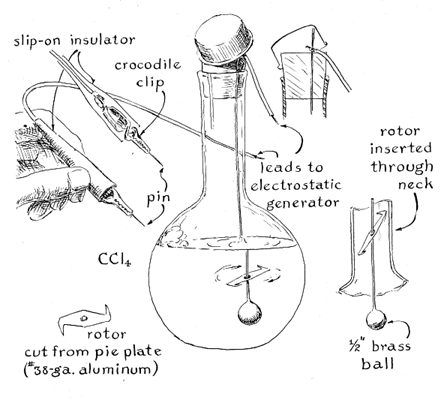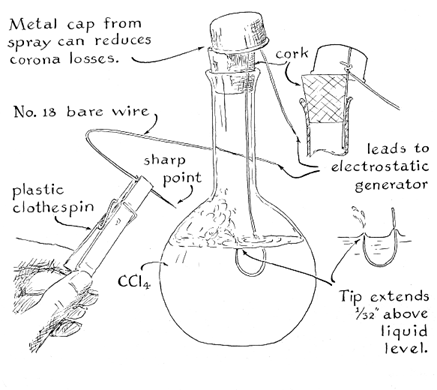 "That the field strength does in fact reach the maximum in the vicinity of a sharply pointed electrode was demonstrated by another experiment. A pound of carbon tetrachloride was placed in a 500-milliliter Florence flask along with a pointed U-shaped wire positioned so that the point protruded about 1/32 inch above the surface of the liquid. The wire was held in place by a groove cut on the side of a cork that closed the flask. (The stopper should be of cork rather than rubber because carbon tetrachloride attacks rubber. The bottle must be closed because the fumes of carbon tetrachloride are toxic. The chemical should be handled only in a well-ventilated room.) "Current leaks from the upper end of the wire in the form of a corona discharge. This loss can be reduced by covering the cork with a rounded metal shield such as the cap from a spray can. The other electrode is also a pointed wire that can be manipulated with a handle such as a clothespin, which should be of plastic because of the high voltage involved [see Figure 1]. "When the two electrodes are connected to the terminals of the generator and the movable electrode is brought close to the side of the flask, the liquid surrounding the partly submerged electrode will become charged with the same polarity as the wire. The force of mutual repulsion is large enough to shoot a stream of liquid into the air perhaps an inch or so above the surface, depending on the voltage applied and the position of the outer electrode. The meniscus that surrounds the wire at the point where it enters the liquid will rise a quarter of an inch.
