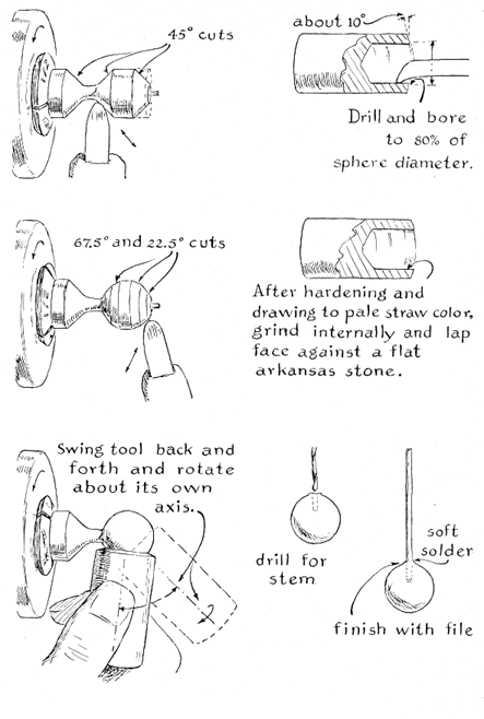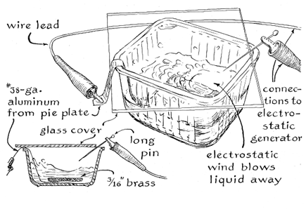 "Next I substituted for the U-shaped electrode a straight wire that terminated in a small metal sphere. Brass balls are simple to make if you have access to a lathe. Place a brass rod of the desired size in the lathe chuck and make two opposing cuts at 45 degrees [see Figure2]. Trim the corners of the angled cuts at 67.5 and 22.5 degrees. The resulting shape is roughly spherical. It is reduced to a true sphere by means of a special tool in the form of a heavy-walled tube of steel, one end of which is sharpened to serve as a cutting edge. The finished diameter of the bore of the tool should be about 80 percent of the intended diameter of the sphere. With the lathe turning at its maximum speed, place the tool in light contact with the sphere and swing it back and forth over the brass while simultaneously rotating it on its own axis. With a little experience the truing operation can be completed in seconds and the finished piece will emerge with a bright, if not polished, surface. The sphere can then be drilled for soldering to a copper wire. "I also made a little whirligig with pointed ends of sheet aluminum and poked a hole through its middle with an awl. The finished piece was threaded on the wire that terminated in the brass sphere and was installed in the flask [see Figure 3]. The second terminal of the generator was connected to a movable point close to the outer surface of the flask. When power was applied, the whirligig spun with much vigor and rose to the surface of the liquid. I turned the tips of the points upward in the hope that the downward thrust of the blades would keep the thing submerged, but it continued rising to the surface (where it made a great sloshing). The position of the external electrode made little difference in the behavior of the whirligig except when it was placed near the surface of the liquid. The rate of spin then increased. "Thereafter I investigated the effect of a pointed electrode that was supported in air close to the surface of the liquid. Pointed electrodes in air create an 'electric wind.' I wanted to check the effect of the wind on the oppositely charged surface of the liquid. A rectangular brass electrode of opposite polarity was placed at the bottom of a refrigerator dish, which was covered by a sheet of glass to prevent the escape of toxic fumes [see Figure 4].