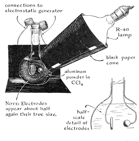 "When a sharp needle was held as shown, the liquid was blown off the brass electrode with a big whoosh. A Van de Graaff generator capable of developing 220,000 volts was then substituted for the Wimshurst machine. (The generator also came from the Edmund Scientific Co.) When the generator was turned on, most of the liquid was promptly blown out of the dish! "After airing the room, I resumed experimenting with the Florence flask. This time I seeded the liquid with a small pinch of aluminum powder of the kind used as a pigment in aluminum paint. My purpose was to observe the interaction of many charged but individually insulated particles. Only a little powder is needed-about the amount that could be piled on the flat end of an unsharpened lead pencil. Most of the powder sank to the bottom of the flask, but many particles remained in suspension for more than 24 hours. "The flask was fitted with a pair of metallic electrodes; one was a thick, rounded disk and the other was a half-inch sphere spaced about an inch away from the center of the disk [see Figure 5]. The flask was lighted on one side by a shielded lamp so that the particles could be observed easily. When the field was applied, some large areas of particles flashed brightly with reflected light and other areas became darker. Evidently the particles aligned themselves with their long dimensions in the direction of the field, some groups reflecting more light in the direction of the eye and others less light. Particles suspended between the electrodes darted continuously back and forth from the disk and the sphere, simulating the movement of electrons and ions in a gas-discharge tube. When one terminal of the machine is attached to the electrodes and the other to a sheet of aluminum foil placed under the flask, all the liquid becomes charged and most of the powder that has settled to the bottom boils up into suspension.