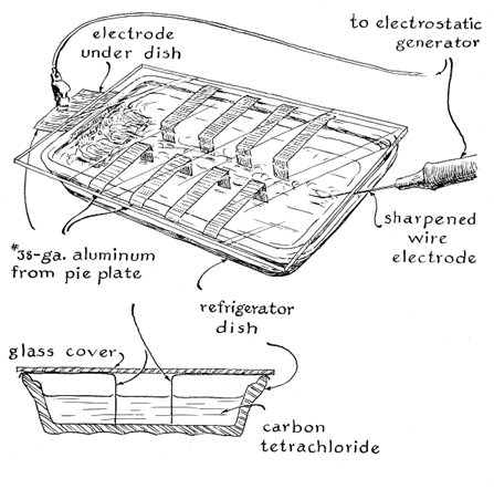 "A pair of straight electrodes was made by cutting two flat strips of metal about five inches long and half an inch wide from an aluminum pie plate, A short length of 18-gauge copper wire was crimped over the center of each strip to serve both as a connection and as a brace to support the strips on edge in the liquid. The strips were placed parallel to each other and about two inches apart. The resulting field turned out to be uniform, as one would expect. The lines were perfectly parallel except at the ends of the plates, where they arched outward. With only a single strip in the liquid and the second terminal of the generator, grounded, a uniform field extended symmetrically from both sides of the electrode. "Single electrodes of various shapes- circular, elliptical, egg-shaped and so on -were then cut from aluminum foil and placed flat in the middle of the dish. These were connected to one terminal of the generator by placing a wire vertically against the center of the electrode. The wire made the necessary connection and also held the aluminum foil in place. "The second electrode again consisted of a circle of wire that ran around the edge of the dish. In every case the field lines made right angles with the edge of the electrodes, just as the textbooks predict. In the case of an egg-shaped electrode the lines bunch together at the small end of the egg, thus demonstrating that the strength of the field varies inversely with the radius of the electrode.