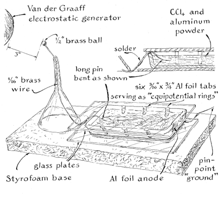 "A sewing needle was now attached to a flexible lead and fitted with an insulating handle so that it could be manipulated. The needle was substituted as an electrode for the aluminum foil under the glass. When the point was brought near the outer surface of the flask, the effect suggested that an electronic wind was blowing through the glass. The particles rushed away from the point in the form of a jet. "This effect gave me the idea of simulating an atom smasher such as the electrostatic accelerator with which the British physicists J. D. Cockcroft and E. T. S. Walton transmuted lithium into unstable beryllium. The first model consisted of a rectangular refrigerator dish about eight inches long and an inch deep, fitted at one end with a sheet of aluminum that served as an electrode [see bottom illustration at right]. A needle point at the other end simulated the source of particles to be accelerated. The aluminum represented the target. Four electrodes were placed along each side of the dish to simulate the equipotential rings that distribute the electric field uniformly along the Cockcroft-Walton accelerator. When power is applied, aluminum particles stream to the target in a beamlike array. For best results the refrigerator dish must rest on a block of Styrofoam to prevent charge from leaking away. If the liquid is carbon tetrachloride, a sheet of glass should be placed between the dish and the plastic to protect the Styrofoam from the solvent. The dish must also be covered with a glass sheet to prevent the escape of the toxic fumes. "I made a second version of the accelerator for use with the Van de Graaff generator. Because of the higher power the number of equipotential 'rings' was reduced to three on each side, and they were placed flat against the sides of the dish [see illustration above]. These electrodes require no wiring. They become charged through the air. The target electrode was grounded, in effect, by a lead that terminated in a needle point facing away from the generator. The accelerating electrode was connected to a lead that terminated in a brass sphere. "Corona discharge between the sphere and the high-voltage terminal of the Van de Graaff machine energizes the apparatus. Once I accidentally grounded the target and moved the generator within about an inch of the small sphere. When I applied power, the intense field blew most of the liquid out of the dish!" James R. Bailey, a high school student in Milwaukee, submits an interesting apparatus that also uses aluminum powder in suspension. It is for displaying convection currents: the streaming induced by gravity in gases and liquids when they are heated or cooled nonuniformly. Bailey writes: "The simple apparatus consists of a shallow glass jar that contains aluminum powder suspended in a volatile solvent such as trichloroethylene, Freon T. F. or wood alcohol. The jar is covered by a glass disk, such as the crystal of an alarm clock, that is sealed in place with epoxy cement. A squat peanut butter jar can be used or, better, a large Petri dish. The aluminum powder can be obtained from dealers in art or sign supplies. Use a very small pinch of the powder, just enough to make fairly dense swirls when it is stirred into the liquid. Particles that persist in floating on the surface after the stirring can be skimmed off and discarded.