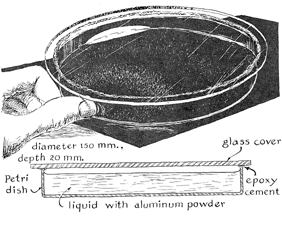 "Place the sealed jar in the refrigerator for a few minutes. When it has cooled, remove it and touch the side at any point with the tip of your finger. Al most instantly vivid silvery waves will rush away from the warmed point toward the center of the jar. The action will persist for several seconds until the glass cools. The reason for the effect is that heat lowers the density of a relatively thick zone of solution at the edge of the dish. Gravity then causes neigh boring liquid of higher density to displace this zone, which spreads over the surface as a thin, high-velocity layer that sinks after cooling. "Many other wave patterns can be generated by heating the jar in different ways. For example, support the jar on a pair of books or small boxes spaced about two inches apart and heat the center of the bottom of the jar with your finger. The resulting waves resemble the action of a boiling spring. Another interesting variation can be observed by letting the jar come to room temperature and then cooling a spot with an ice cube. By this means one reverses the action. "Avoid exposing the device to excessive temperature. The resulting high pressure could break the seal. The sol vents used are all toxic to some extent and most are flammable. The aluminum powder is not dangerous but makes a terrible mess if it is spilled. It can be dissolved with a strong solution of potassium hydroxide, sodium hydroxide or common lye. The finished apparatus is sturdy and inexpensive, and it never wears out. Like a kaleidoscope or an open fire, it generates abstract patterns of endless variety."