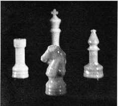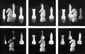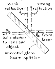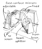 "The subject to be photographed should consist of small objects that will stand still. Chessmen are a good example. The available light from a homemade laser limits the size of the scene to about one square foot if the exposure is to be kept within a five-minute interval. The photographic plate should be placed vertically, facing the subject at a distance of about 10 inches. First, however, place a piece of white cardboard in the position the plate will occupy. The cardboard should match the size of the plate. "Darken the room, direct the rays of the laser into the beam splitter and adjust the lens of the appropriate beam to floodlight the object. (The laser does not have to be on the stable table.) Block off this beam and adjust the lens and mirrors so that the second beam, as reflected by the small and large mirrors, floods the cardboard screen. If the diagram [Figure 6] has been followed carefully, the distance from the beam splitter to the object to the cardboard screen will be approximately equal to the distance from the beam splitter to the small mirror, large mirror and cardboard. In no case should an inequality exceed half of the length of the laser. If scattered light from the laser tube is perceptible on the screen, enclose the laser in an opaque housing. "The two beams that now fall on the screen must be adjusted for relative intensity. The beam from the mirror should be two to three times brighter than the rays reflected to the screen by the object. The brightness is difficult to estimate, but it is not too critical. If the reference beam seems too bright, try shifting the position of the lens so that it picks up the rays that are reflected by the second surface of the beam splitter. If the beam still seems too bright, move the lens closer to the splitter or insert a neutral-density filter in the beam at the point where it is reflected from the beam splitter. If a filter is so used, place it exactly at right angles to the axis of the beam; otherwise light will be reflected back and forth internally between the glass surfaces and will introduce unwanted interference effects. "The angle made at the photographic plate between rays from the object and those of the reference beam should not exceed 30 degrees. The spacing of the lines in the hologram varies inversely with the size of this angle and becomes so narrow at angles approaching 90 degrees that problems arise. Now replace the cardboard screen with the photographic plate. The emulsion side should face the object. (The emulsion side of a plate can be determined by the fact that it will stick to your lip.) The best emulsion for holograms is the Eastman Kodak Company's 649F, which comes in the form of four-inch by five-inch glass plates, packed 36 to a box. The plates are fairly expensive. They can be obtained from the Edmund company in smaller quantities. Other emulsions of lower resolving power can be made to work by using a narrow angle between the reference beam and the object beam. This arrangement generates somewhat broader fringes, which are better for such emulsions, but the adjustment is difficult and I do not recommend it to the beginner. "Just before making the exposure, direct the laser beam into the interferometer and examine the fringes for movement. If they appear solid, switch the rays to the hologram beam splitter and make the exposure. A dim safelight can be used if it is kept at least 15 feet from the plate. The exposure time is a matter of trial and error. If the object is colored and not more than three inches in diameter, a laser output of five milliwatts should make an exposure of optimum density in about three minutes. If the plates are stored in a refrigerator, allow at least 30 minutes for them to reach room temperature before use. The Eastman Kodak Company recommends that 649F plates be developed for five minutes at 67 degrees Fahrenheit in Eastman H. R. P. developer. Thereafter the plates are fixed, washed and dried. "The dried hologram can be inspected immediately for an image. Place the plate in the diverged beam of the laser at the angle of the reference beam. You should then see-the object. Rotate the plate from side to side to find the angle that yields maximum brightness. Alternatively you can inspect the hologram by placing a filter of almost any color in the slide holder of a 35-millimeter projector and fitting a pinhole mask over the front surface of the projection lens. You can even use a flashlight of the penlight type if it is fitted with a self-focused bulb. When inspected by flashlight, the hologram will be fuzzy and the image will appear in the colors of the rainbow. "If no image can be found, the probability is high that something moved during the exposure. Examine the plate under a microscope at a magnification of about 600 diameters. The pattern should consist of fine, crisscrossed lines. If these lines are not seen, some part of the apparatus certainly moved during the exposure If the emulsion is much darker or lighter than a conventional photographic transparency, appropriately increase or decrease the exposure during the next try. If the object has poor contrast, increase or decrease the intensity of the reference beam. "You do not have to make a hologram to have fun with these fascinating playthings. Relatively inexpensive holograms on film can now be bought, with a viewing filter, from the Edmund company. A number of engrossing experiments can be done with them. Try photographing the reconstructed light. You will discover that either the focus must be altered for recording sharp images of foreground and background objects or the lens must be stopped down to increase the depth of the field. Try making photographs of I various areas of the hologram. Each portion, however small, will reproduce the entire scene-yet the information contained by each area differs from that of other areas. The principal difference involves the effects of parallax: the relative displacement of objects