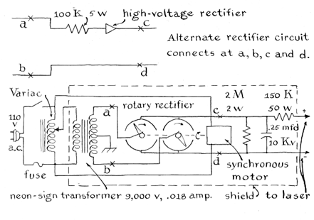 "The first requirement for making holograms is a laser. Mine was built at home. The apparatus described previously in this department will work splendidly if it is modified to develop somewhat more power and to generate light waves of a single frequency. The output power can be increased substantially by operating the laser on direct current, a requirement that is simple to meet A string of two or more silicon rectifiers, such as type CR210, can be connected in one lead of the neon-sign transformer as indicated by the accompanying illustration [right]. The resulting unidirectional current is smoothed by connecting a capacitor across the output of the rectifiers. The circuit must also include two resistors, one for limiting the current in the rectifiers and the second to compensate for the negative resistance of the laser tube. High-voltage rectifiers are expensive. The experimenter who has more time than money can substitute a synchronous rotary switch.