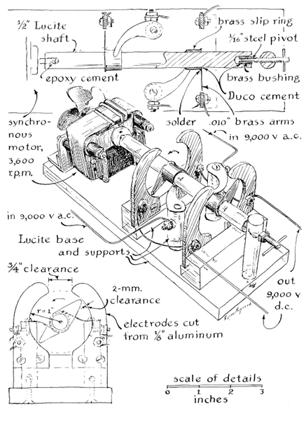"The switch consists of an insulating shaft that carries two switch arms spaced 180 degrees apart. Each arm passes close to but does not touch an opposing pair of semicircular electrodes [left]. In the case of 60-cycle operation the switch arm rotates synchronously at 3,600 revolutions per minute. It is driven by a Barber-Coleman synchronous motor, type KYAJ622-328. The motor is available from the Edmund Scientific Co., 101 East Gloucester Pike, Barrington, N.J. 08007. The base of the switch and the supports for the electrodes can be made of Lucite or any comparable insulating material. "Alternating current is connected to the switch arms through brushes made of brass shim stock that ride on brass slip rings. The slip rings make a snug fit with the shaft. Other essential mechanical details are evident in the illustration. The inner diameter of the semicircular electrodes must be at least two inches, and opposing electrodes must be spaced at least three-quarters of an inch apart. All the other dimensions can differ from those shown. "When the synchronous switch is in operation, the blades must stand midway between the opposing semicircular electrodes at the beginning of each cycle. They must complete half of a revolution at the end of each alternation of current. In other words, the switch must operate in phase with the alternating current. "To set the switch arms in phase, connect one output lead of the neon-sign transformer to the brush of one switch arm and connect the other output lead of the transformer to one of the semicircular electrodes. Apply power to the neon-sign transformer from a variable-voltage transformer, such as a Variac. Connect the motor to the power line. When the motor comes up to full speed and is running synchronously, gradually apply power to the neon-sign transformer and observe the gap between the switch arm and the electrode. When the voltage has been increased sufficiently, sparks will bridge the gap.