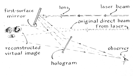 "If the exposure were made with ordinary light, the photographic plate would merely blacken. Every part of the plate receives light from every point on the object and from the mirror. Laser light, however, is coherent: the waves are identical in length, and they proceed in step. At some points on the photographic plate the crests of waves reflected by the object coincide with the crests of waves in the reference beam. The two waves reinforce each other and expose the photographic emulsion at that point. At other places the crests of waves reflected by the object coincide with the valleys of waves in the reference beam. They cancel, so that the plate receives less exposure. Such interference effects vary at all points on the plate, depending on the shape and surface texture of the object. "The pattern of fine lines in a hologram has the property of diffracting, or bending, light rays. The diffraction is greater with close spacing than with narrow spacing. Advantage is taken of this effect in the hologram to reconstruct the light waves that were reflected by the object. Rays that enter the hologram from the same direction as the reference beam are bent and scattered precisely, enough to match those that were reflected by the object. In effect they duplicate the object rays. The light used for reconstructing the object rays should be coherent, but remarkable realism can be achieved with ordinary colored light emitted from a pinhole source.