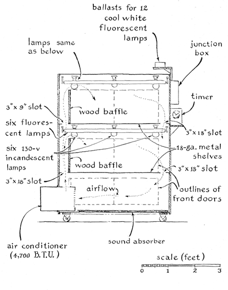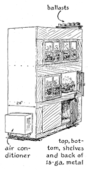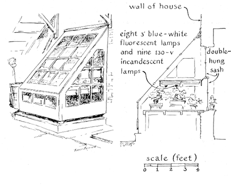 "Inexpensive light meters calibrated in footcandles are now available for measuring the intensity. Alternatively, simple tables for converting the indication of photographic exposure meters to footcandles can be compiled easily. Intensity can also be estimated. A pair of cool white 30-watt rapid-start fluorescent tubes that operate with a 40-watt ballast in a twin fixture will deliver about 1,100 footcandles at a distance of six inches from the tubes, 650 footcandles at 12 inches and 500 footcandles at 18 inches. Within a 30-degree eone below the tubes the intensity falls off uniformly to about 80 percent at the edge. "At present I have two small greenhouses. One, a lean-to, is installed outside a rear window of our ground-floor apartment [see illustration above]. During part of the day the unit receives direct sunlight. The natural light is supplemented as desired by a battery of electric lights controlled automatically by a clock timer. "The second chamber was constructed in the form of an ornamental cabinet, the basic details of which are shown in the accompanying illustration [Figure 1]. It consists of two compartments for growing stacked above a third compartment that houses an air conditioner, electrical controls and miscellaneous supplies. The lamps are suspended from the inner surface of the top of the cabinet and the bottom of the top compartment. They are controlled by the preset clock timer; the control for the air conditioner is a Honeywell Airswitch (type T-631-C) that operates when the temperature changes three degrees from the value at which the switch is set. "Lamps develop a substantial quantity of heat that must be removed to prevent the temperature of the chamber from rising above 75 degrees Fahrenheit, the maximum to which common houseplants should be exposed. Fluorescent tubes operate at relatively low temperature and present no problem. The associated ballasts radiate a fair amount of heat, however, and must be located outside the growth chamber. I installed mine on the top of the cabinet.