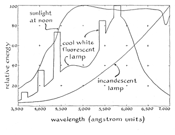 "In what proportions should the lamps be combined? The question has not been fully resolved. When I built my first battery of lamps, the optimum proportion was thought to be 10 watts of fluorescent light to each watt of incandescent light. Since then the recommended ratio has gradually changed. Some experiment stations, including the U.S. Department of Agriculture's Agricultural Research Service in Beltsville, Md., have used ratios in which the wattages of fluorescent and incandescent light are equal. The results of my own experiments appear to favor the closer proportions. "Power consumption is doubtless a poor index of spectral intensity because it neglects the performance characteristics of the lamps. A lamp of one type may radiate far more energy in certain portions of the spectrum than a lamp of another, depending on the design of the lamp and the voltage at which it operates. The variation occurs particularly in incandescent lamps. For fluorescent lamps I now use 30-watt cool white tubes of the rapid-start type equipped with ballasts, or transformers, designed to operate 40-watt tubes. Driving the lamps above their normal rating increases the emission of the desired blue light by 30 percent but does not appreciably shorten the life of the tubes. The trick will work only with 30-watt tubes. "Ordinary incandescent lamps can be used for radiating the essential red light When they are operated at their rated voltage, however, they do not emit strongly in the far red. For this reason I have switched to lamps that are rated at 130 volts. These lamps are used chiefly by industry in inaccessible places where lighting requirements are not severe and where the cost of replacing bulbs must be minimized. Although the lamps are rated at 130 volts, they are operated on 120 volts. Hence they last several times longer than conventional lamps. The yellowish-red emission is ideal for plants.