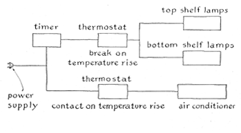 "These extended-service lamps are available from dealers in electrical supplies in the same wattages and at the same prices as standard lamps. They should not be confused with the long-life bulbs that are currently advertised. I now use six 30-watt fluorescent tubes in combination with six 15-watt incandescent lamps, a power ratio of 180 watts of fluorescent lighting to 90 watts of incandescent lighting. "The structural details of mounting the lights and associated fixtures are determined largely by the application. For example, if the experimenter merely wishes to floodlight a shelf of plants, the hardware can be screwed to a simple wood frame suspended from the ceiling. In this case the fluorescent tubes can be mounted in standard twin-tube fixtures attached to the wood frame. The incandescent lamps can be spaced uniformly between the fluorescent fixtures. Normally the lamps will face downward. Heated air will rise from the lamps, so that porcelain sockets should be used. If the initial cost is a secondary consideration, the experimenter may wish to install a battery of the special fixtures that have been developed recently for service in miniature greenhouses. The fixtures provide space for both fluorescent and incandescent lamps in a single unit. "The optimum quantity of light to be used varies with the requirements of the plant. In nature plants grow under a wide range of light intensities, from as little as 10 footcandles to about 10,000. Philodendron will thrive at intensities as low as 50 to 100 footcandles; African violets do nicely at 600 footcandles, and orchids need 1,000. My experiments indicate that most popular varieties of flowering houseplants grow best at intensities ranging from 1,000 to 2,000 footcandles. Some growth chambers found in horticultural laboratories are equipped for lighting levels as high as 8,500 footcandles.