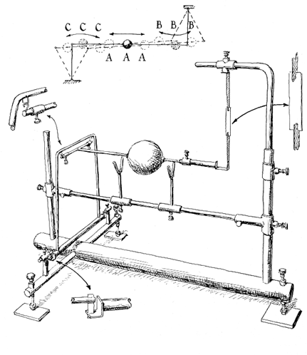 "The ball and the disk must be washed with a detergent to remove the film of grease that is invariably present; they must also be painted with a thin solution of Aquadag or an equivalent substance that conducts electric current. (Aquadag is a product of the Acheson Colloid Company, Port Huron, Mich. 48060.) When the conducting film has dried, the ball can be plated. (A conducting silver paint is made by E:. I. du Pont de Nemours & Co.) "My plating solution consists of copper sulfate, sulfuric acid and distilled water in the proportions of 32 ounces of copper sulfate and eight ounces of sulfuric acid, by weight, to each gallon of water. Copper flashing, of the kind available from dealers in building supplies, can be used for the anode of the plating bath. The plating current should be limited to about .02 ampere per square inch of surface until a thin film of copper forms over the entire area to be plated. The current can then be increased to .3 ampere per square inch of surface. The direct-current supply must be capable of maintaining a potential of between one and four volts when it is under load. An automobile storage battery can be used as the supply if a suitable rheostat for regulating the current is included in the circuit. An instrument for measuring current is essential. "Another mechanical linkage, known as Scott-Russell's straight-line motion, was modified to operate as a pendulum of any desired period. It is free to vibrate in any vertical plane. In principle it consists of two rods, one of which is hinged to the other in the form of a distorted T [see Figure 2]. The weight of the assembly is supported by the leg of the T through an appropriate hinge, such as a pivot or a spring suspension. The bob is carried by one end of the crossbar of the T. "The motion of the opposite end of the crossbar is constrained; that end is free to move up and down but not sideways. The constraint was accomplished by attaching three radial guy wires to the end of the crossbar and anchoring them to the supporting framework. In the diagram the leg of the T is represented by the line od' and the crossbar by the line dd". The motion of the d" end of the crossbar is restricted to the line of". When the proportions of the rods are made as illustrated by the solid lines od', dd' and d'd", the bob will traverse the straight line bb' and the period of the pendulum will be infinite. If the length of the portion of the crossbar between d' and d" is made shorter but all other dimensions are retained as indicated at e'e", the curvature of the arc will increase inversely with the length of e'e". The system will then function as a conventional pendulum. When the length d'd" is increased, as at f'f", the path of the bob will bend downward as indicated by the arc of. The pendulum will then be unstable and the bob will fall from its center position to one of the limits of excursion.